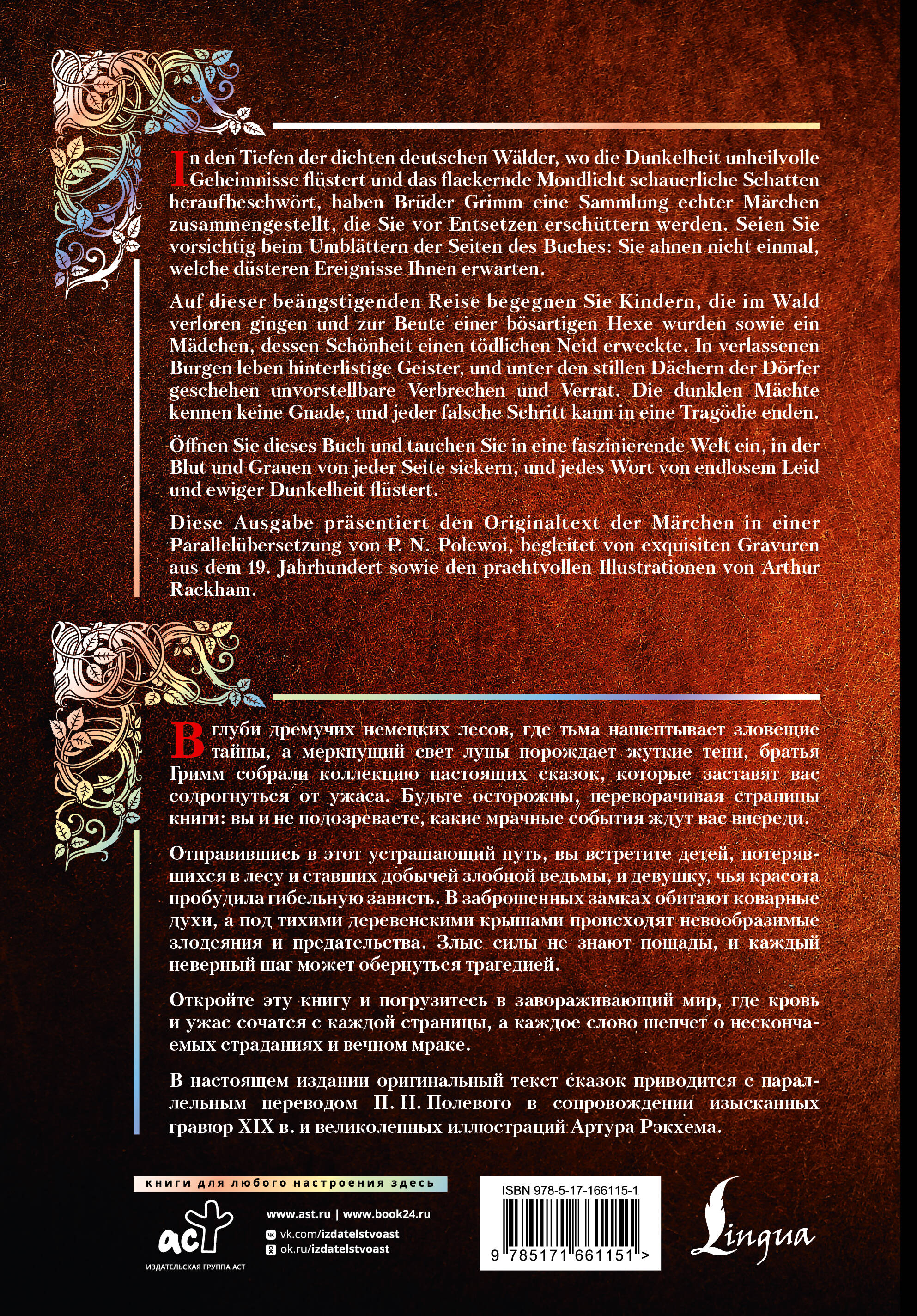 В глуби дремучих немецких лесов, где тьма нашептывает зловещие тайны, а меркнущий свет луны порождает жуткие тени, братья Гримм собрали коллекцию настоящих сказок, которые заставят вас содрогнуться от ужаса. Будьте осторожны, переворачивая страницы книги: вы и не подозреваете, какие мрачные события ждут вас впереди.