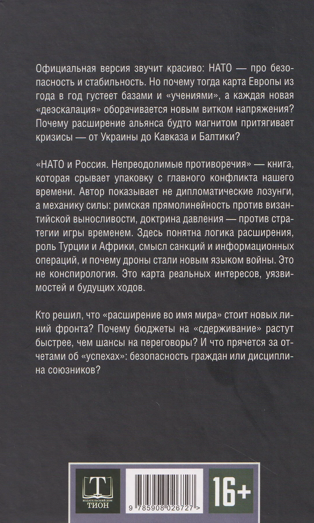 Официальная версия звучит красиво: НАТО про безопасность и стабильность. Но почему тогда карта Европы из года в год густеет базами и учениями, а каждая новая деэскалация оборачивается новым витком напряжения? Почему расширение альянса будто магнитом притягивает кризисы от Украины до Кавказа и Балтики?НАТО и Россия. Непреодолимые противоречия книга, которая срывает упаковку с главного конфликта нашего времени. Автор показывает не дипломатические лозунги, а механику силы: римская прямолинейность против византийской выносливости, доктрина давления против стратегии игры временем. Здесь понятна логика расширения, роль Турции и Африки, смысл санкций и информационных операций, и почему дроны стали новым языком войны. Это не конспирология. Это карта реальных интересов, уязвимостей и будущих ходов. Кто решил, что расширение во имя мира стоит новых линий фронта? Почему бюджеты на сдерживание растут быстрее, чем шансы на переговоры?