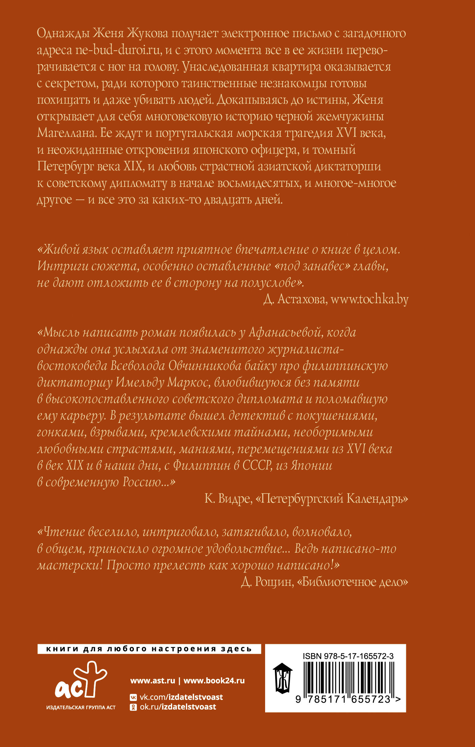 Однажды Женя Жукова получает электронное письмо с загадочного адреса ne-bud-duroi.ru, и с этого момента все в ее жизни переворачивается с ног на голову. Унаследованная квартира оказывается с секретом, ради которого таинственные незнакомцы готовы похищать и даже убивать людей. Докапываясь до истины, Женя открывает для себя многовековую историю черной жемчужины Магеллана. Ее ждут и португальская морская трагедия XVI века, и неожиданные откровения японского офицера, и томный Петербург века XIX, и любовь страстной азиатской диктаторши к советскому дипломату в начале восьмидесятых, и многое-многое другое — и все это за каких-то двадцать дней.
