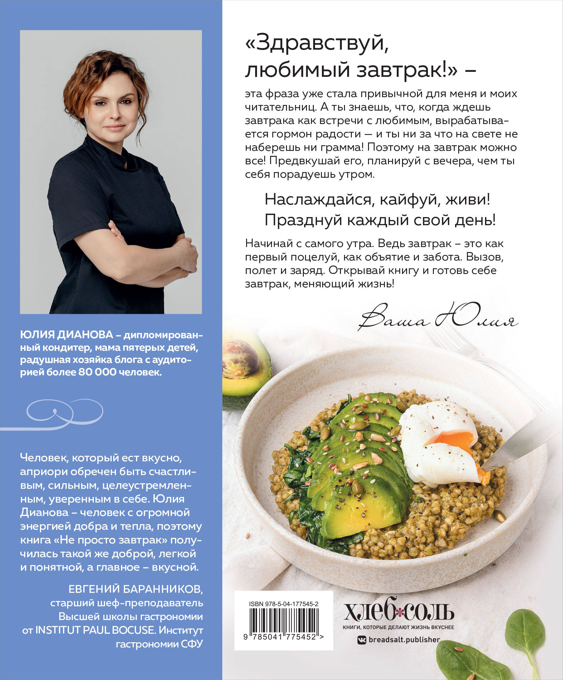 «Здравствуй, любимый завтрак!» — именно такими словами автор книги Юлия Дианова советует начинать свой день. В дебютной книге профессионального кондитера, популярного блогера, заботливой мамы пятерых детей и просто энергичной и очаровательной женщины вы сможете найти все для того, чтобы сделать утро ярким и вкусным! Автор уверен, что когда ждешь завтрака, как встречи с любимым, вырабатывается гормон радости, и вы ни за что на свете не наберете ни грамма! Поэтому на завтрак можно все! Драники с рийетом из лосося, рисовая каша с халвой, шакшука или колоритный турецкий завтрак? Круассан с печеным перцем, соусом песто и моцареллой или дрожжевые оладьи с яблоками? Выбирайте, готовьте, радуйте себя и близких! Пусть ваше утро будет вкусным!