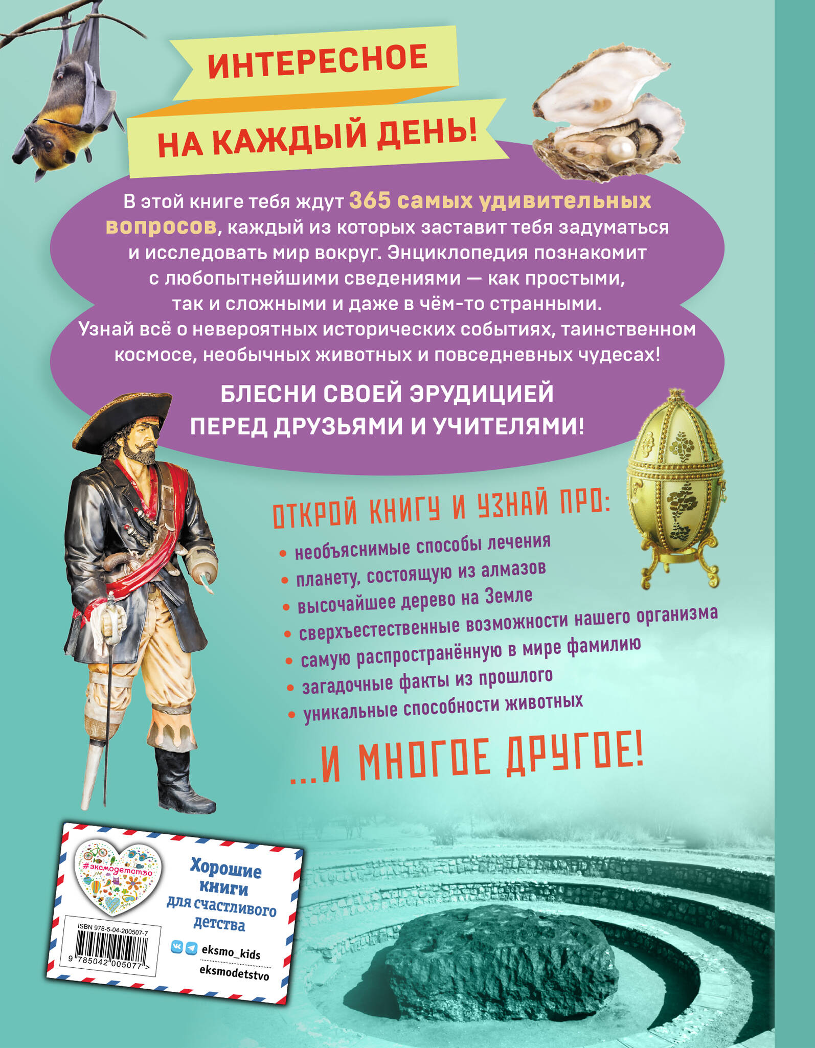 Энциклопедия на все 365 дней в году в самом популярном формате вопросов и ответов, разработанная специально для ребят 10—12 лет! В одной книге — целых 365 ответов на все вопросы школьника обо всём на свете: невероятные возможности тела человека, загадочные факты из прошлого, уникальные способности животных и многое другое. Полезная информация изложена просто и доступно, поэтому чтение увлечёт ребёнка и легко наполнит новыми знаниями и интересом к изучению мира вокруг. А яркое оформление превратит эту энциклопедию в идеальную настольную книгу любознательного школьника.