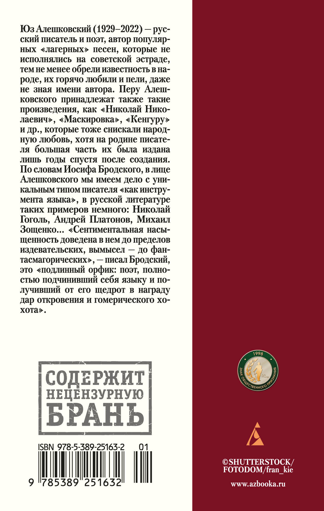 Юз Алешковский (1929–2022) — русский писатель и поэт, автор популярных "лагерных" песен, которые не исполнялись на советской эстраде, тем не менее обрели известность в народе, их горячо любили и пели, даже не зная имени автора. Перу Алешковского принадлежат также такие произведения, как "Николай Николаевич", "Маскировка", "Кенгуру" и др., которые тоже снискали народную любовь, хотя на родине писателя большая часть их была издана лишь годы спустя после создания. По словам Иосифа Бродского, в лице Алешковского мы имеем дело с уникальным типом писателя "как инструмента языка", в русской литературе таких примеров немного: Николай Гоголь, Андрей Платонов, Михаил Зощенко... "Сентиментальная насыщенность доведена в нем до пределов издевательских, вымысел — до фантасмагорических", — писал Бродский, это "подлинный орфик: поэт, полностью подчинивший себя языку и получивший от его щедрот в награду дар откровения и гомерического хохота".