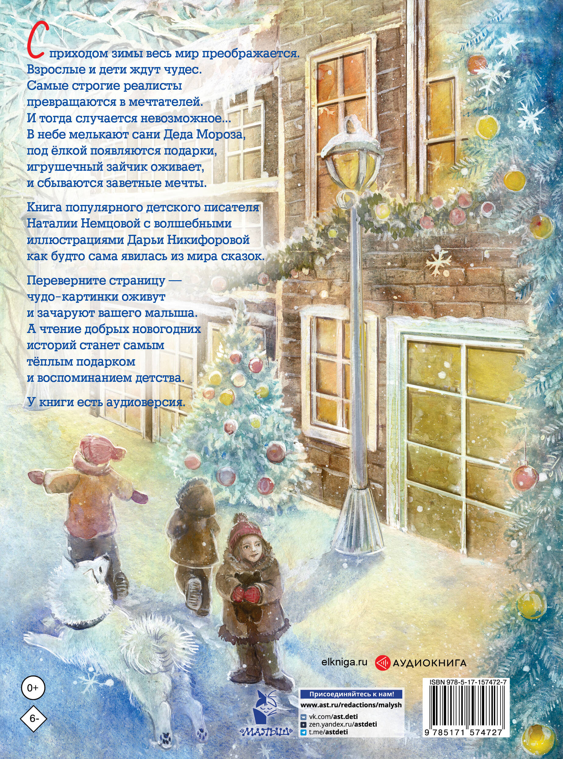 С приходом зимы весь мир преображается. Взрослые и дети ждут чудес. Самые строгие реалисты превращаются в мечтателей, верят в волшебство. И тогда случается невозможное... В небе мелькают сани Деда Мороза, под ёлкой появляются подарки, игрушечный зайчик оживает и сбываются самые заветные мечты. Книга популярного детского писателя Наталии Немцовой с волшебными иллюстрациями Дарьи Никифоровой как будто сама явилась из мира сказок. Переверните страницу — чудесная картинка-панорамка оживет и зачарует вашего малыша. А чтение добрых новогодних историй станет самым тёплым подарком и воспоминанием детства.