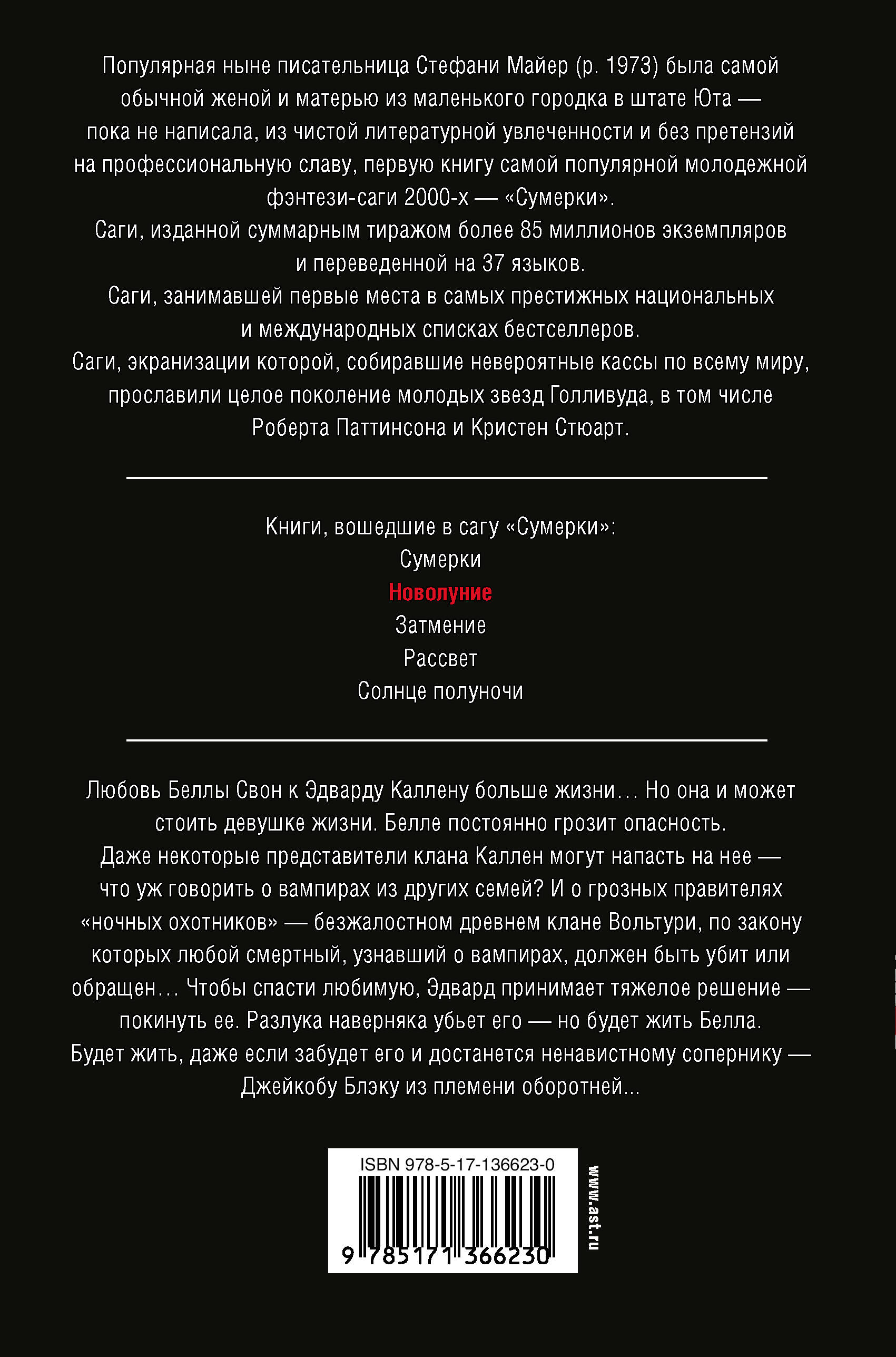 История любви старшеклассницы и вампира покорила сердца миллионов людей. Стефани Майер, создательница саги «Сумерки», два года подряд признавалась лучшей писательницей США, её книги были переведены на 38 языков, а общий тираж «Сумеречной саги» превышает 150 000 000 экземпляров. Сага легла в основу одноимённой киносерии с Робертом Паттисоном и Кристен Стюарт в главных ролях, пять фильмов цикла заработали в мировом прокате свыше 4 миллиардов долларов.