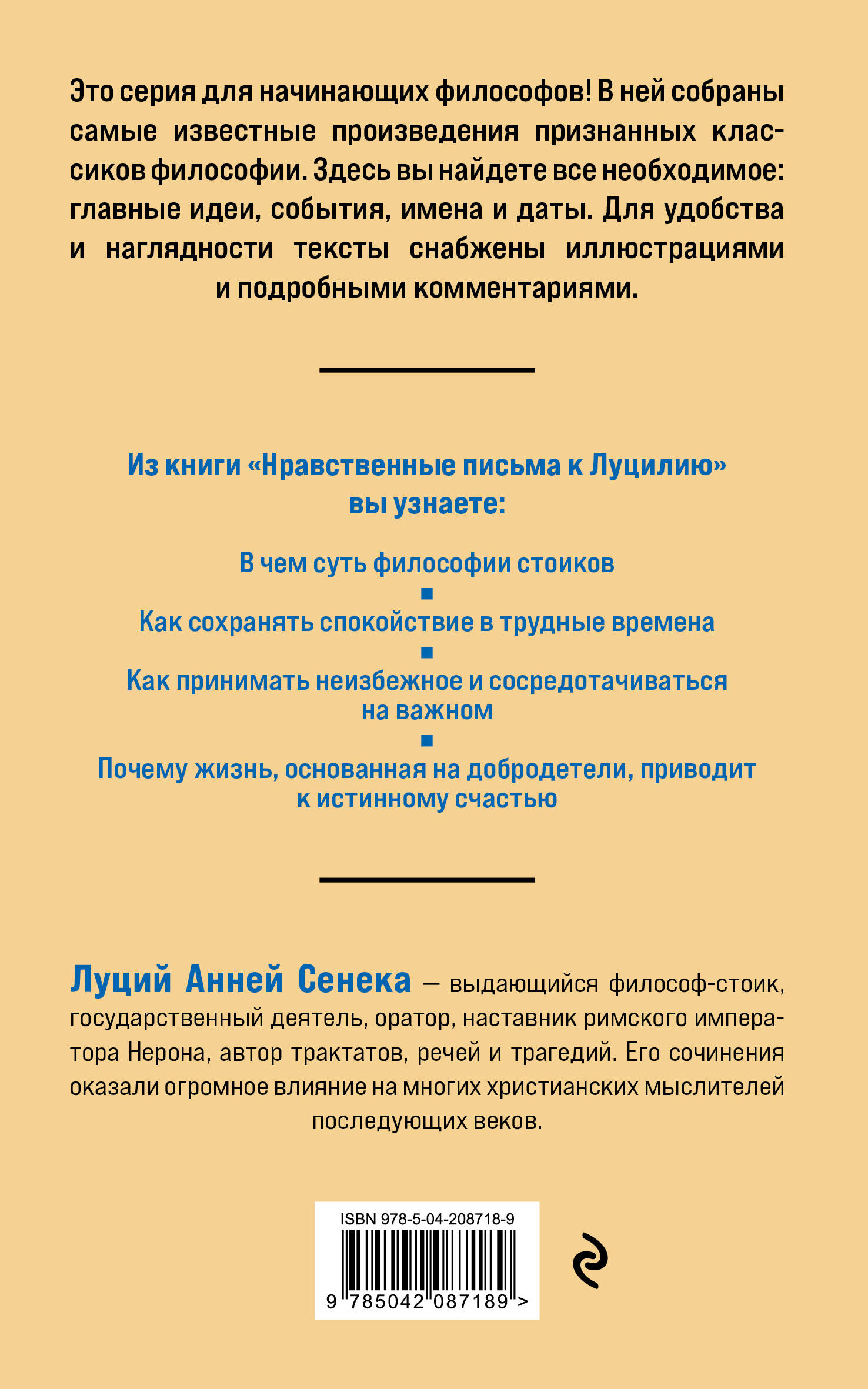 «Философия для начинающих» — серия для начинающих философов и мыслителей! В ней собраны самые известные произведения признанных классиков философии. Здесь вы найдете все необходимое: главные идеи, события, имена и даты. Для удобства и наглядности тексты снабжены иллюстрациями и подробными комментариями. «Нравственные письма к Луциллию» в переводе П.Н. Краснова — это сборник писем древнеримского философа Сенеки, в которых он делится своими размышлениями о жизни, морали и философии. Он обсуждает важность самопознания, внутреннего спокойствия и стойкости перед лицом жизненных невзгод, считая, что счастье зависит от нашего отношения к событиям. Философия стоиков, основы которой заложены Сенекой, акцентирует внимание на контроле над человеческими эмоциями и привязанностями, а также на стремлении к добродетели как высшей цели. В своих письмах Сенека призывает к разумному подходу к жизни и поиску гармонии с природой и самим собой.