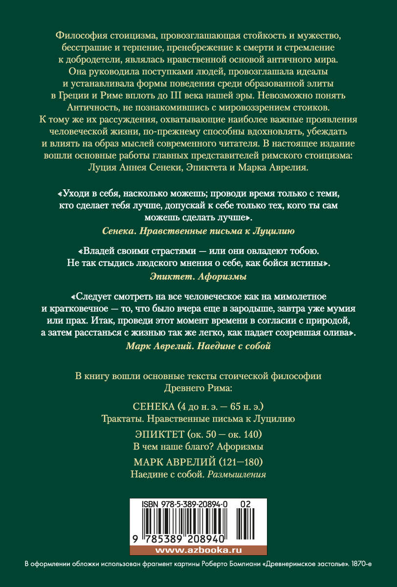 В настоящее издание вошли основные работы главных представителей римского стоицизма: Луция Аннея Сенеки, Эпиктета и Марка Аврелия.