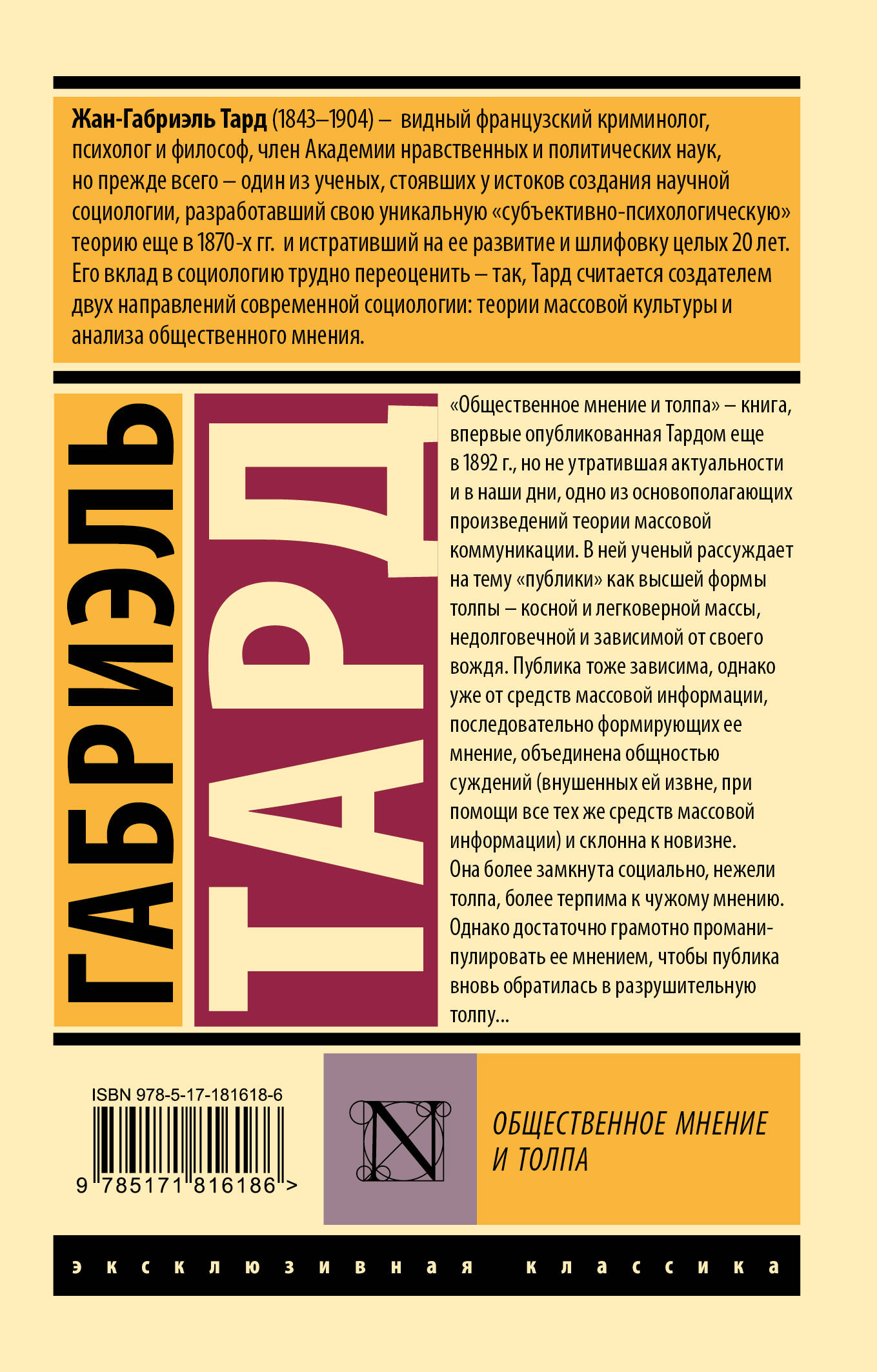 "Общественное мнение и толпа" — книга, впервые опубликованная Тардом еще в 1892 г., но не утратившая актуальности и в наши дни, одно из основополагающих произведений теории массовой коммуникации. В ней ученый рассуждает на тему "публики" как высшей формы толпы — косной и легковерной массы, недолговечной и зависимой от своего вождя.