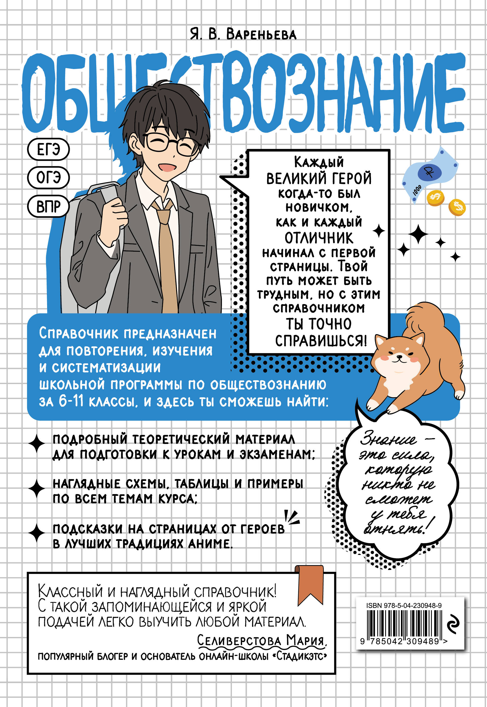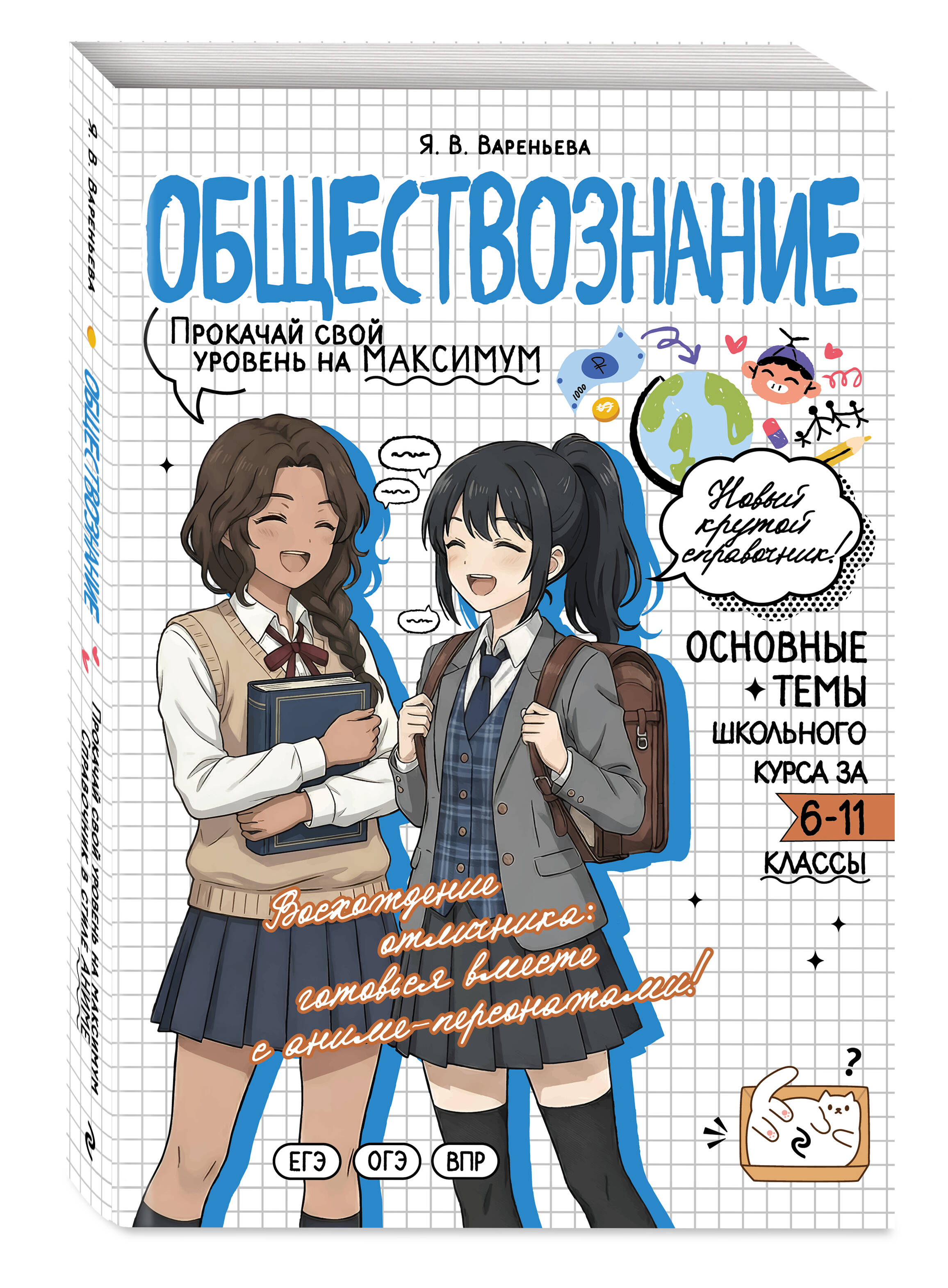 Справочник по обществознанию в аниме-стиле — это современное учебное пособие для учащихся 6—11 классов, которое объединяет школьные знания и визуальную эстетику аниме-культуры. Вместо сухих определений и скучных параграфов на страницах книг вас будут ждать милые и смешные аниме-персонажи, чьи подсказки помогут разобрать материал любой сложности в более живом и увлекательном формате, подготовиться к урокам или предстоящим экзаменам. Более того, вся теория дополнительно сопровождается удобными схемами, забавными рисунками и наглядными примерами. Такой креативный визуальный подход к обучению обеспечивает лёгкость восприятия и эффективность запоминания информации. Прокачай свой уровень на максимум и пройди весь школьный курс вместе с героями в стиле аниме!
