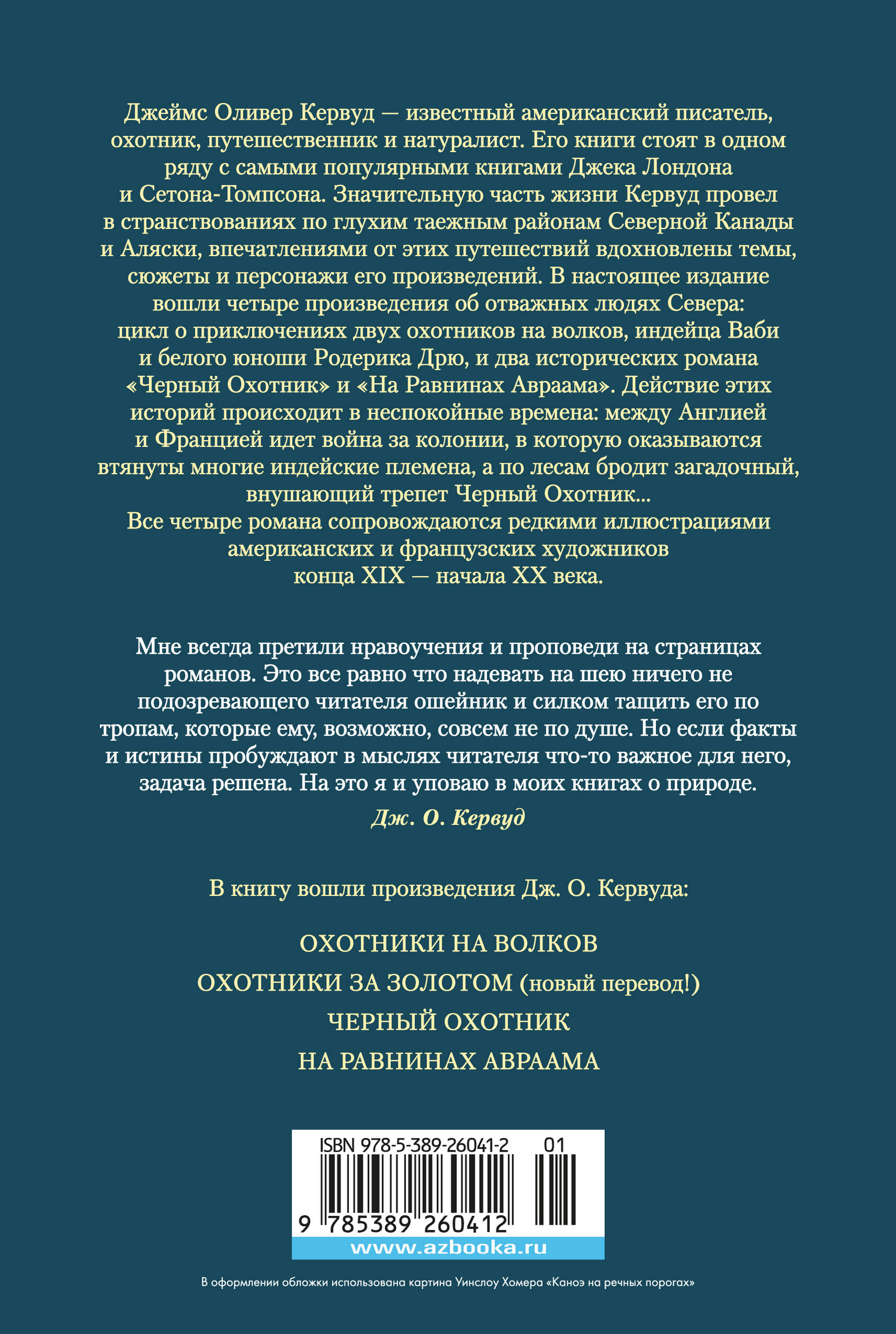 Джеймс Оливер Кервуд — известный американский писатель, охотник, путешественник и натуралист. Его книги стоят в одном ряду с самыми популярными книгами Джека Лондона и Сетона-Томпсона. Значительную часть жизни Кервуд провел в странствованиях по глухим таежным районам Северной Канады и Аляски, впечатлениями от этих путешествий вдохновлены темы, сюжеты и персонажи его произведений. В настоящее издание вошли четыре произведения об отважных людях Севера: цикл о приключениях двух охотников на волков, индейца Ваби и белого юноши Родерика Дью, и два исторических романа «Черный Охотник» или «На Равнинах Авраама». Действие этих историй происходит в неспокойные времена: между Англией и Францией идет война за колонии, в которую оказываются втянуты многие индейские племена, а по лесам бродит загадочный, внушающий трепет Черный Охотник…