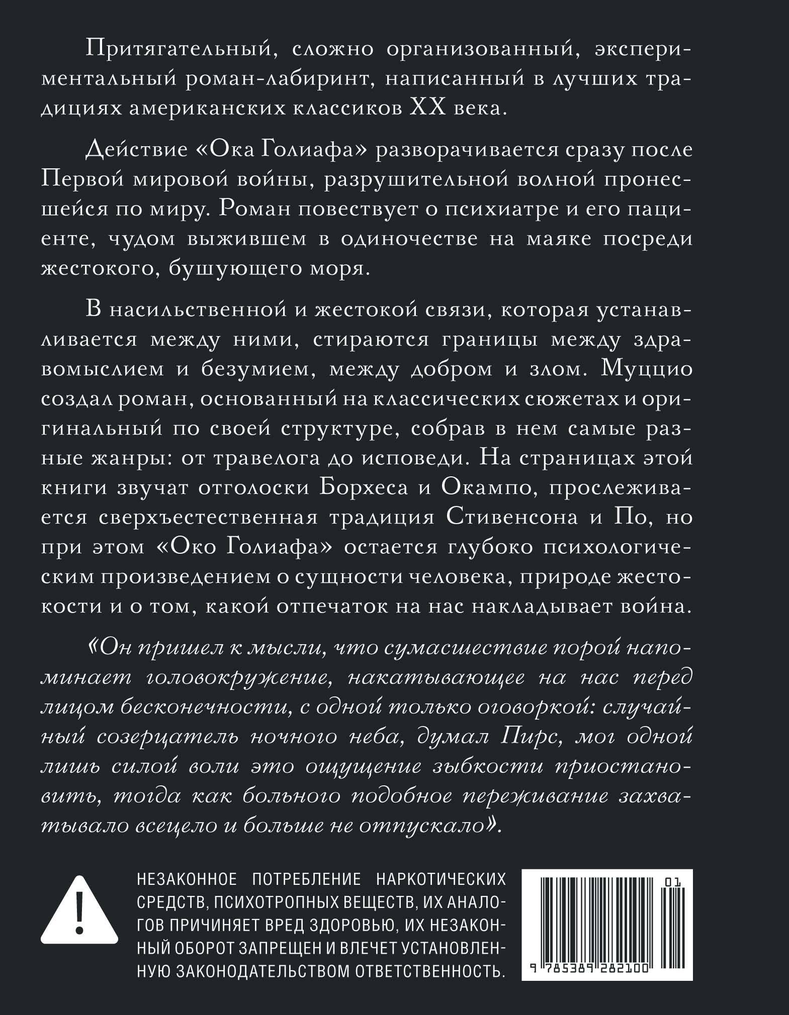 В насильственной и жестокой связи, которая устанавливается между ними, стираются границы между здравомыслием и безумием, между добром и злом. Муццио создал роман, основанный на классических сюжетах и оригинальный по своей структуре, собрав в нем самые разные жанры: от травелога до исповеди. На страницах это книги звучат отголоски Борхеса и Окампо, прослеживается сверхъестественная традиция Стивенсона и По, но при этом «Око Голиафа» остается глубоко психологическим произведением о сущности человека, природе жестокости и о том, какой отпечаток на нас накладывает война