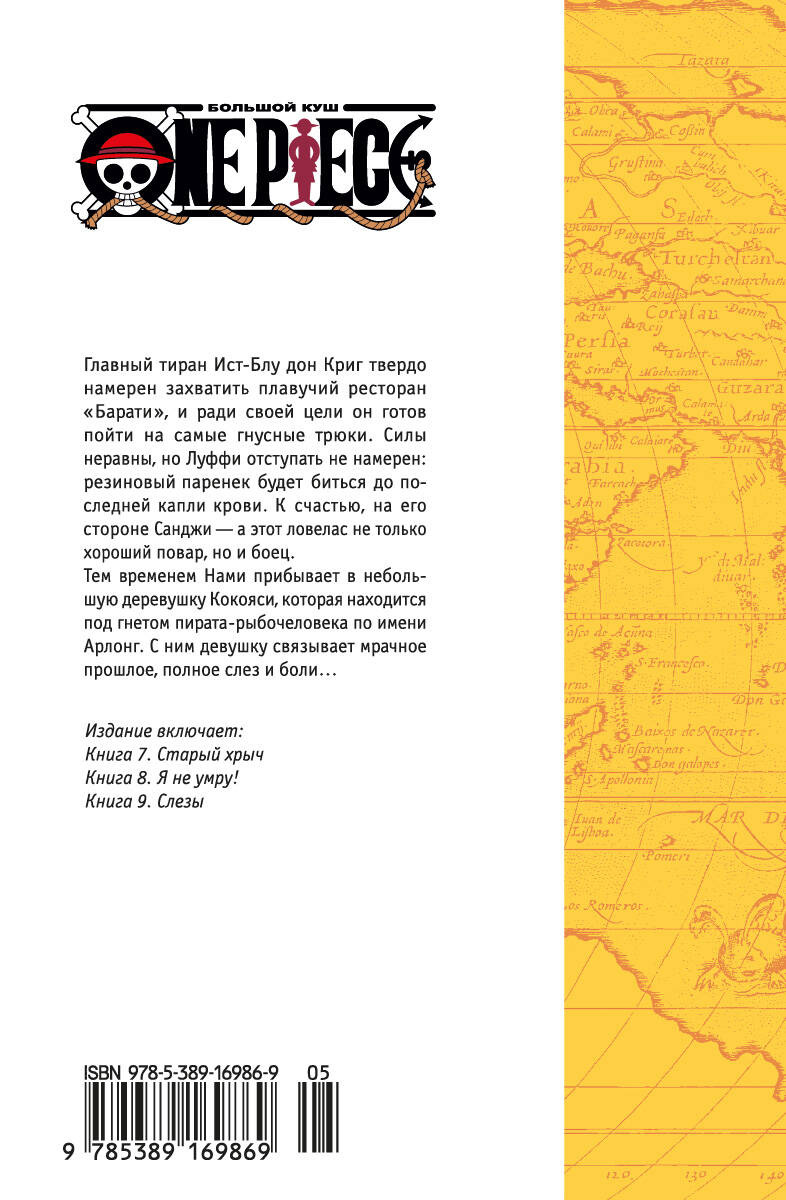 Главный тиран Ист-Блу дон Криг твердо намерен захватить плавучий ресторан "Барати" и ради своей цели он готов пойти на самые гнусные трюки. Силы неравны, но Луффи отступать не намерен: резиновый паренек будет биться до последней капли крови. К счастью, на его стороне Санджи – а этот ловелас не только хороший повар, но и боец. Тем временем Нами прибывает в небольшую деревушку Кокояси, которая находится под гнетом пирата-рыбочеловека по имени Арлонг. С ним девушку связывает мрачное прошлое, полное слез и боли…