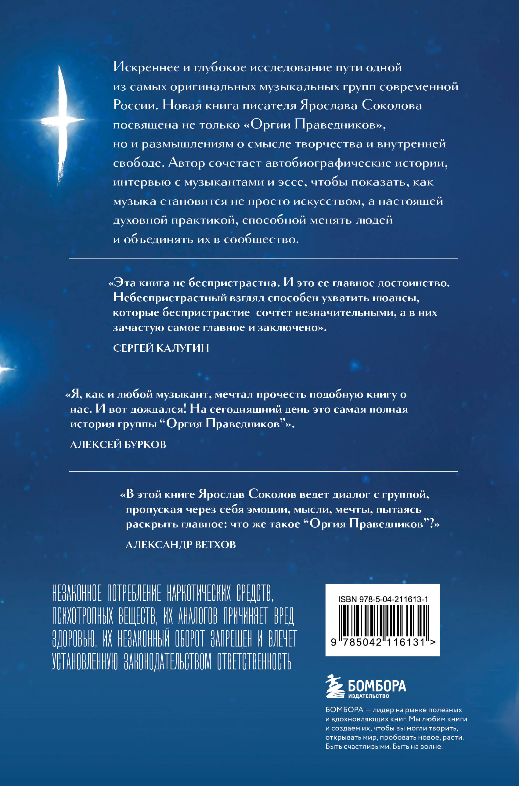 Ярослав Соколов создает яркие портреты всех участников «Оргии Праведников», раскрывая их биографии, характеры и музыкальные пристрастия. Алексей Бурков — это человек контрастов, обладающий масштабной личностью, философским мышлением и трудоголизмом; Сергей Калугин — поэт с внутренней ранимостью, скрытой за маской брутальности; Тёма Бондаренко — основательный и харизматичный басист, отвечающий за стабильность; Саша Ветхов — барабанщик с уникальным стилем и внутренней силой. Каждый из них — отдельная вселенная, и только их сочетание рождает уникальное звучание ОП, которое поначалу может оттолкнуть, но при внимательном погружении открывает глубокий смысл и сложную гармонию, которые так ценят поклонники группы вот уже почти 30 лет.