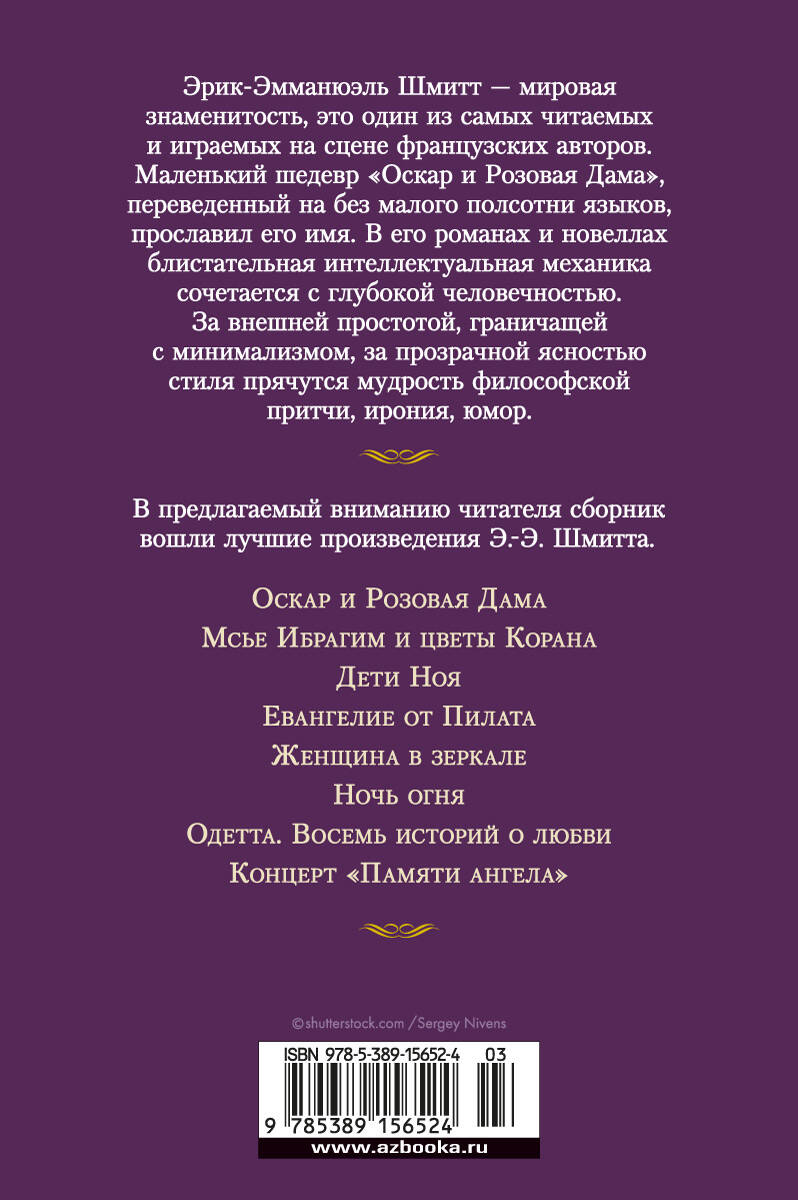Эрик-Эмманюэль Шмитт - мировая знаменитость, это один из самых читаемых и играемых на сцене французских авторов. Маленький шедевр "Оскар и Розовая Дама", переведенный на без малого полсотни языков, прославил его имя. В его романах и новеллах блистательная интеллектуальная механика сочетается с глубокой человечностью. За внешней простотой, граничащей с минимализмом, за прозрачной ясностью стиля прячутся мудрость философской притчи, ирония, юмор.