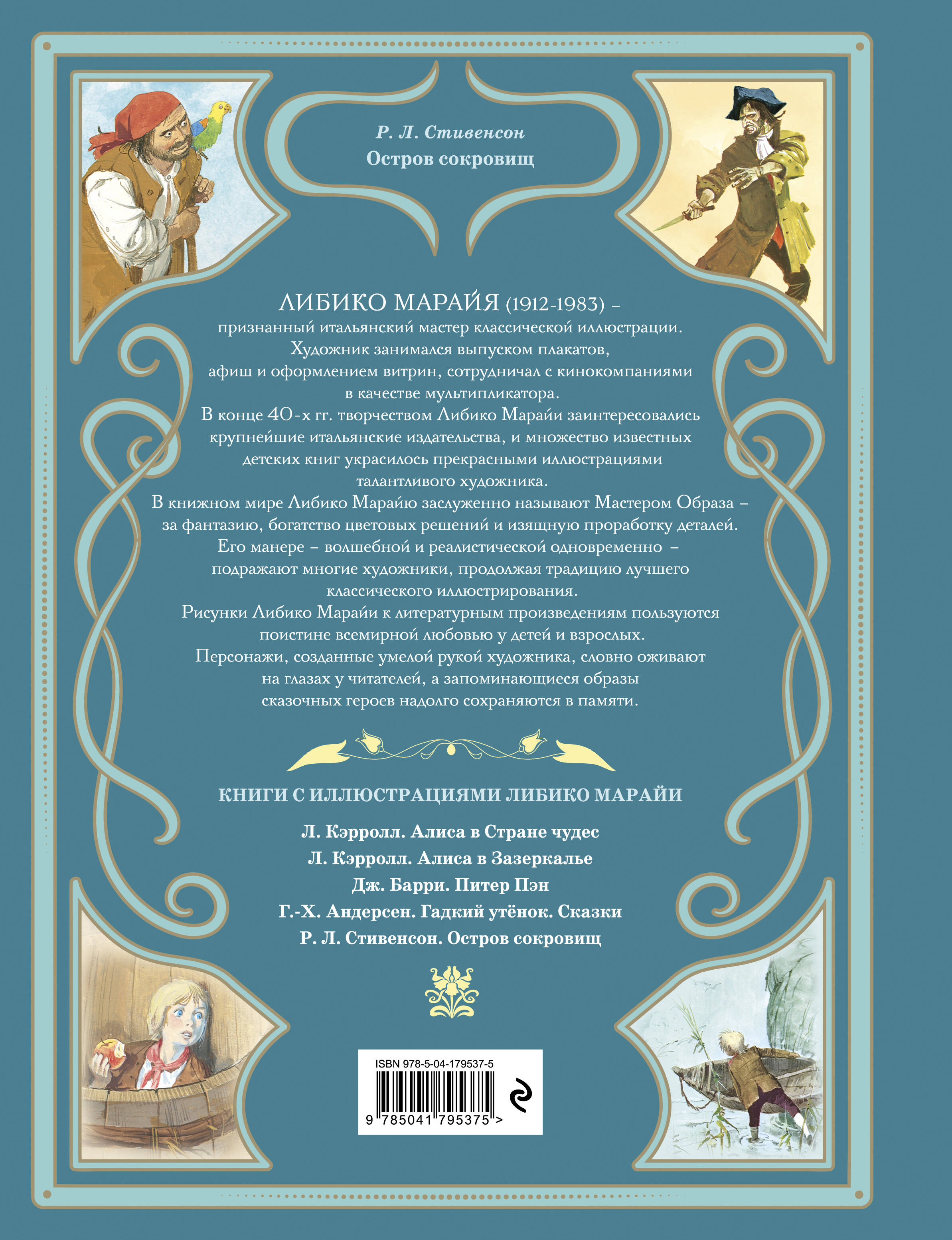 Необыкновенные иллюстрации к книге «Остров сокровищ» нарисовал известный итальянский художник Либико Марайя. Современники называли его Мастером Образа в классической книжной иллюстрации. И не случайно герои и сюжеты, созданные его кистью, обретают удивительную выразительность, уникальные черты и особый колорит. Сам художник называл иллюстрированную книгу театром, в разнообразии которого заключена сама жизнь.
