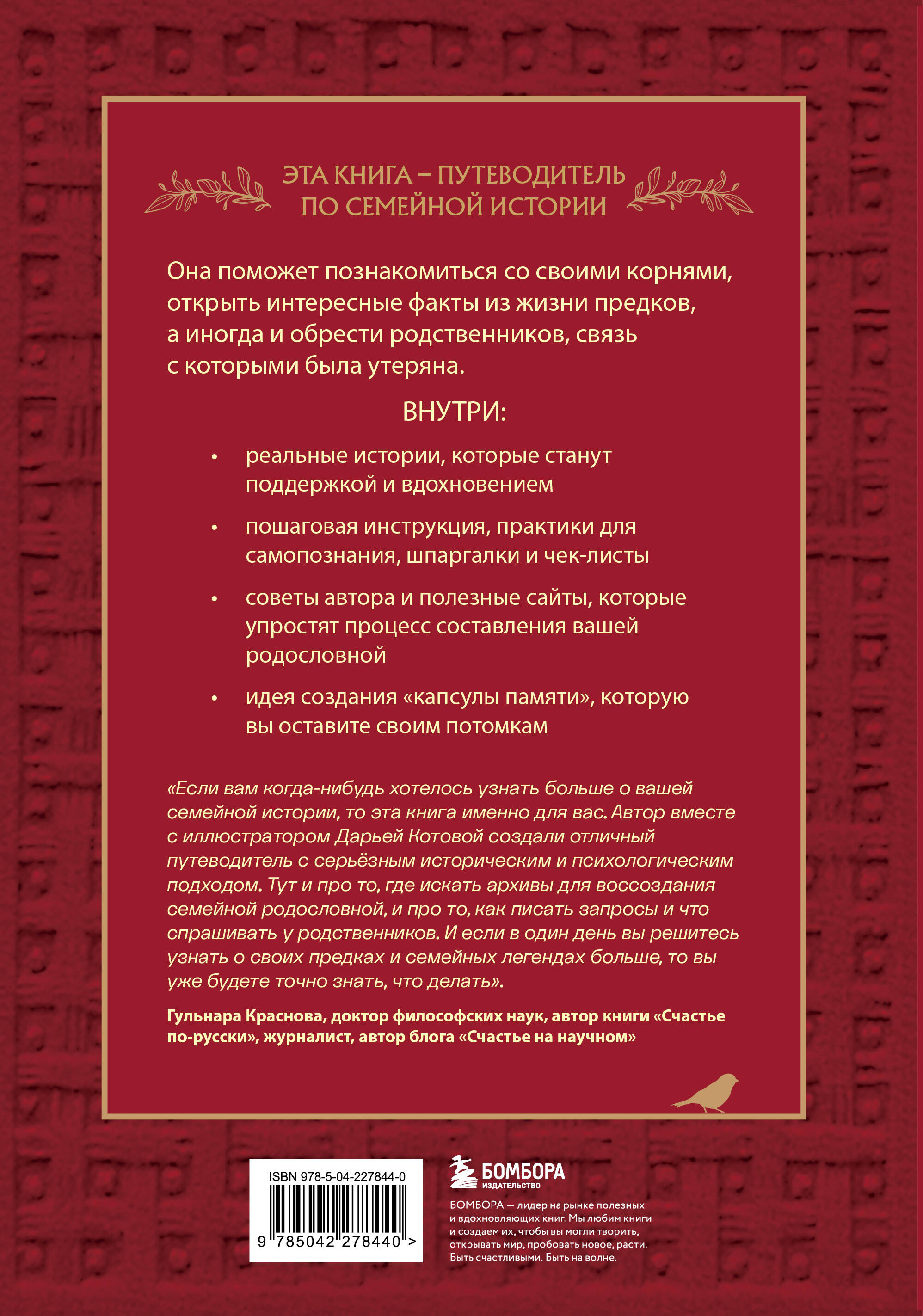«Если вам когда-нибудь хотелось узнать больше о вашей семейной истории, то эта книга именно для вас. Автор вместе с иллюстратором Дарьей Котовой создали отличный путеводитель с серьёзным историческим и психологическим подходом. Тут и про то, где искать архивы для воссоздания семейной родословной, и про то, как писать запросы, и что спрашивать у родственников. И если в один день вы решитесь узнать о своих предках и семейных легендах больше, то вы уже будете точно знать, что делать». — Гульнара Краснова, доктор философских наук, автор книги «Счастье по-русски», журналист, автор блога «Счастье на научном»