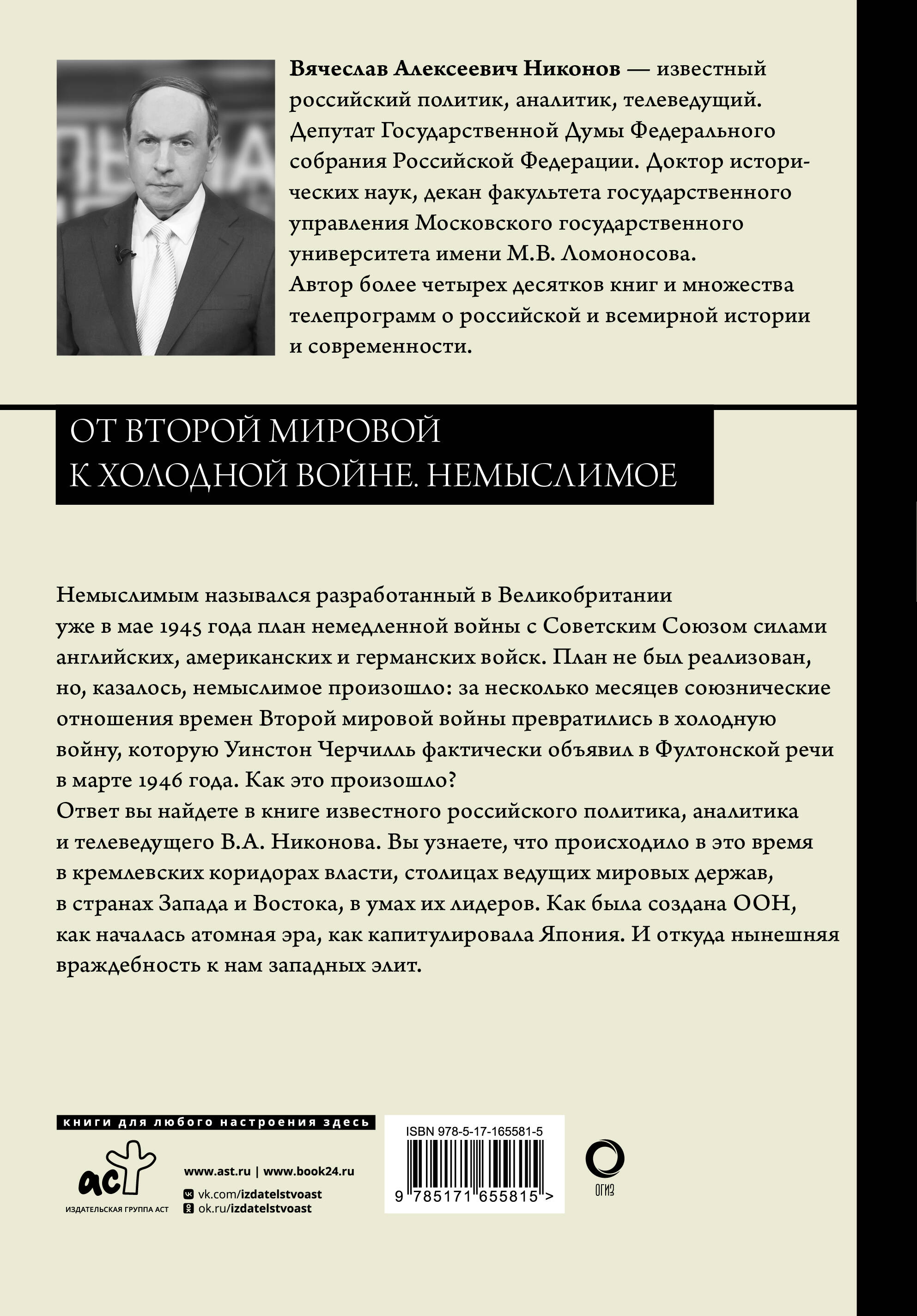 Немыслимым назывался разработанный в Великобритании уже в мае 1945 года план немедленной войны с Советским Союзом силами английских, американских и германских войск. План не был реализован, но, казалось, немыслимое произошло: за несколько месяцев союзнические отношения времен Второй мировой войны превратились в холодную войну, которую Уинстон Черчилль фактически объявил в Фултонской речи в марте 1946 года. Как это произошло? Ответ вы найдете в книге известного российского политика, аналитика и телеведущего В.А. Никонова. Вы узнаете, что происходило в это время в кремлевских коридорах власти, столицах ведущих мировых держав, в странах Запада и Востока, в умах их лидеров. Как была создана ООН, как началась атомная эра, как капитулировала Япония. И откуда нынешняя враждебность к нам западных элит.