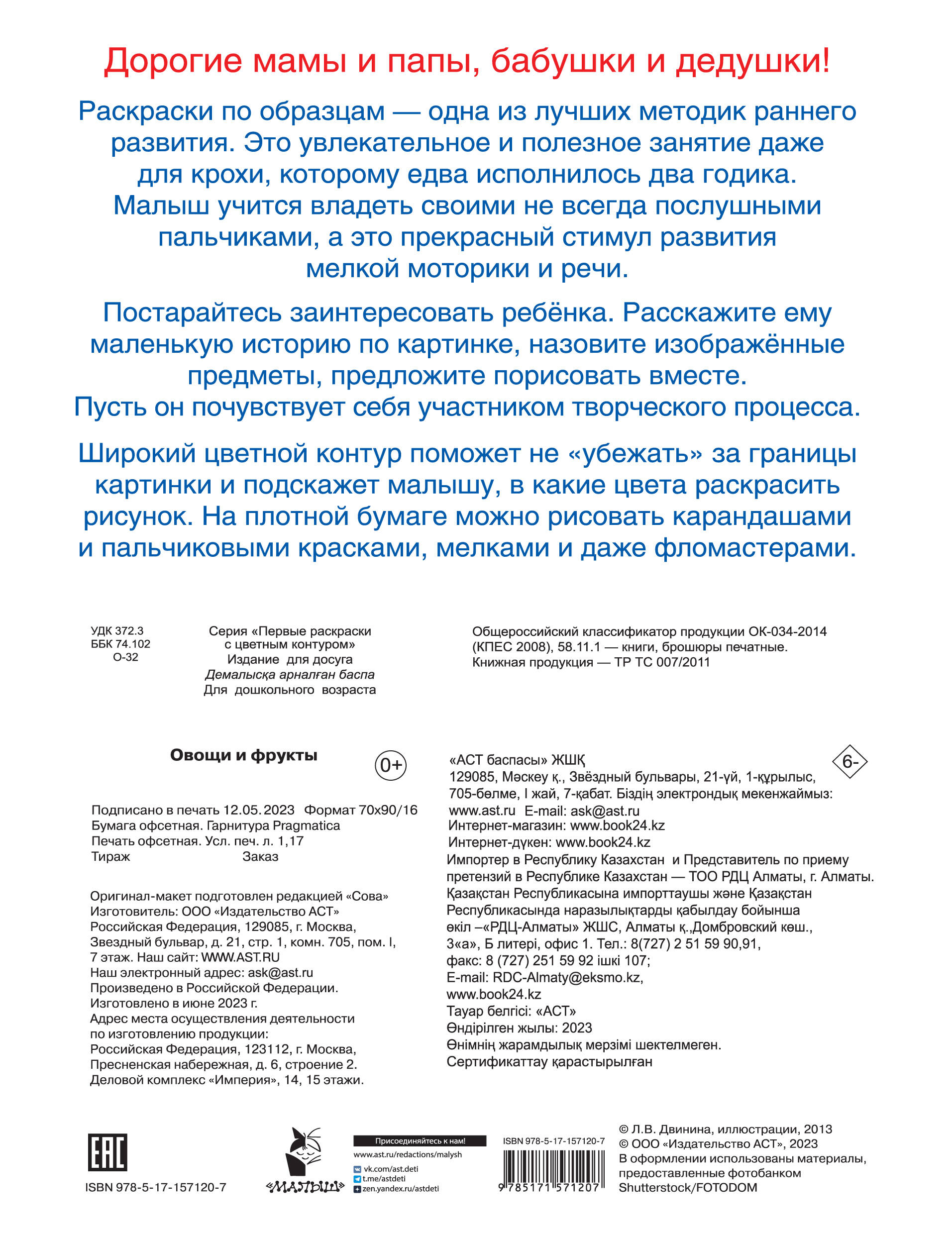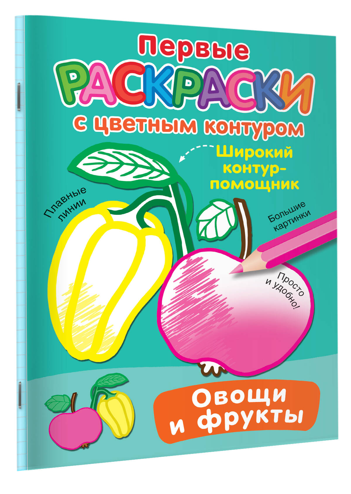 Развивающая раскраска "Овощи и фрукты" — прекрасный подарок для маленьких художников, которые только учатся держать в руке карандаш или фломастер. Это крупные картинки с широким цветным контуром и образцами для раскрашивания. Малыш разовьёт мелкую моторику и координацию движений руки, зрительное восприятие и внимание.