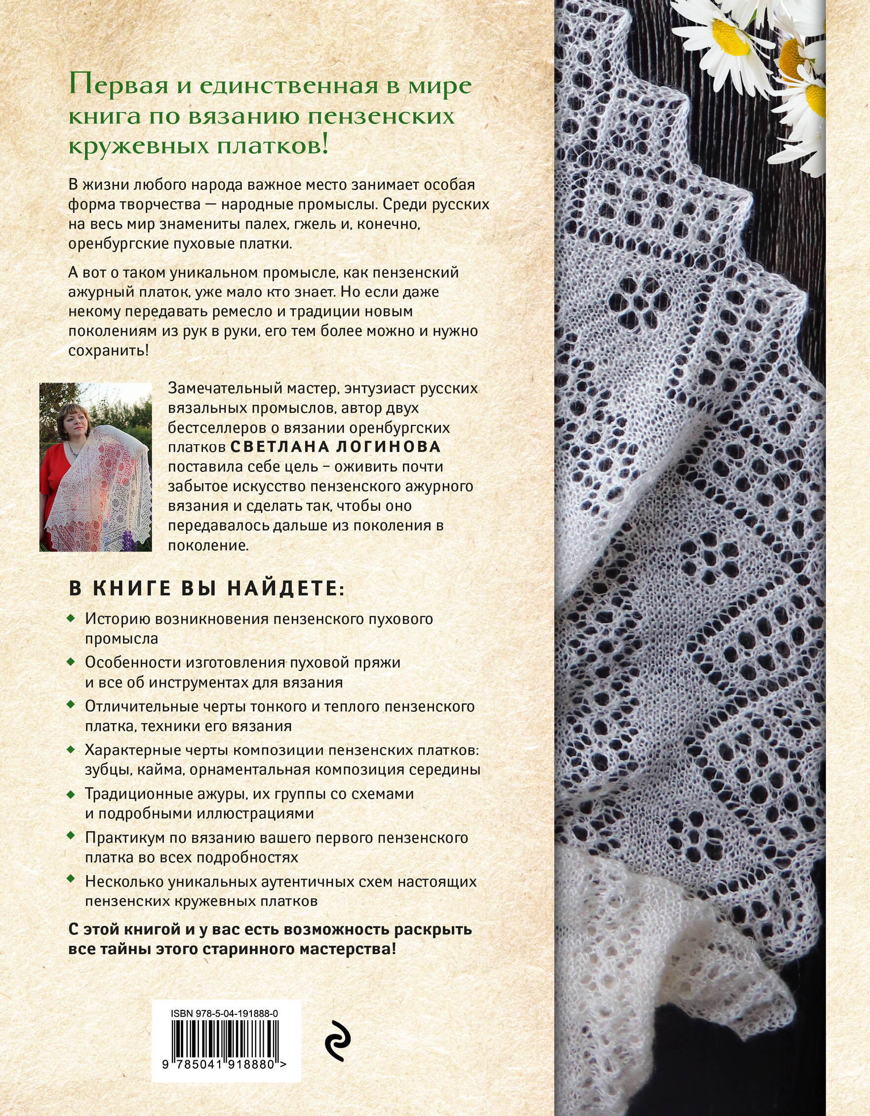 В новой книге замечательный русский мастер Светлана Логинова, автор двух бестселлеров об Оренбургском пуховом платке, взялась раскрыть все тайны почти забытого старинного ремесла! И перед нами снова Пензенский платок предстает не только в правилах, принципах и техниках вязания, определенном наборе красивейших орнаментов и тонкостях подготовки и выбора пряжи, но и в настоящих произведениях вязального искусства! Вы сможете воспроизвести любое изделие, которое когда-то вязали пензенские мастерицы, по понятным и подробными инструкциям, четким схемам и многочисленным подсказкам в книге!
