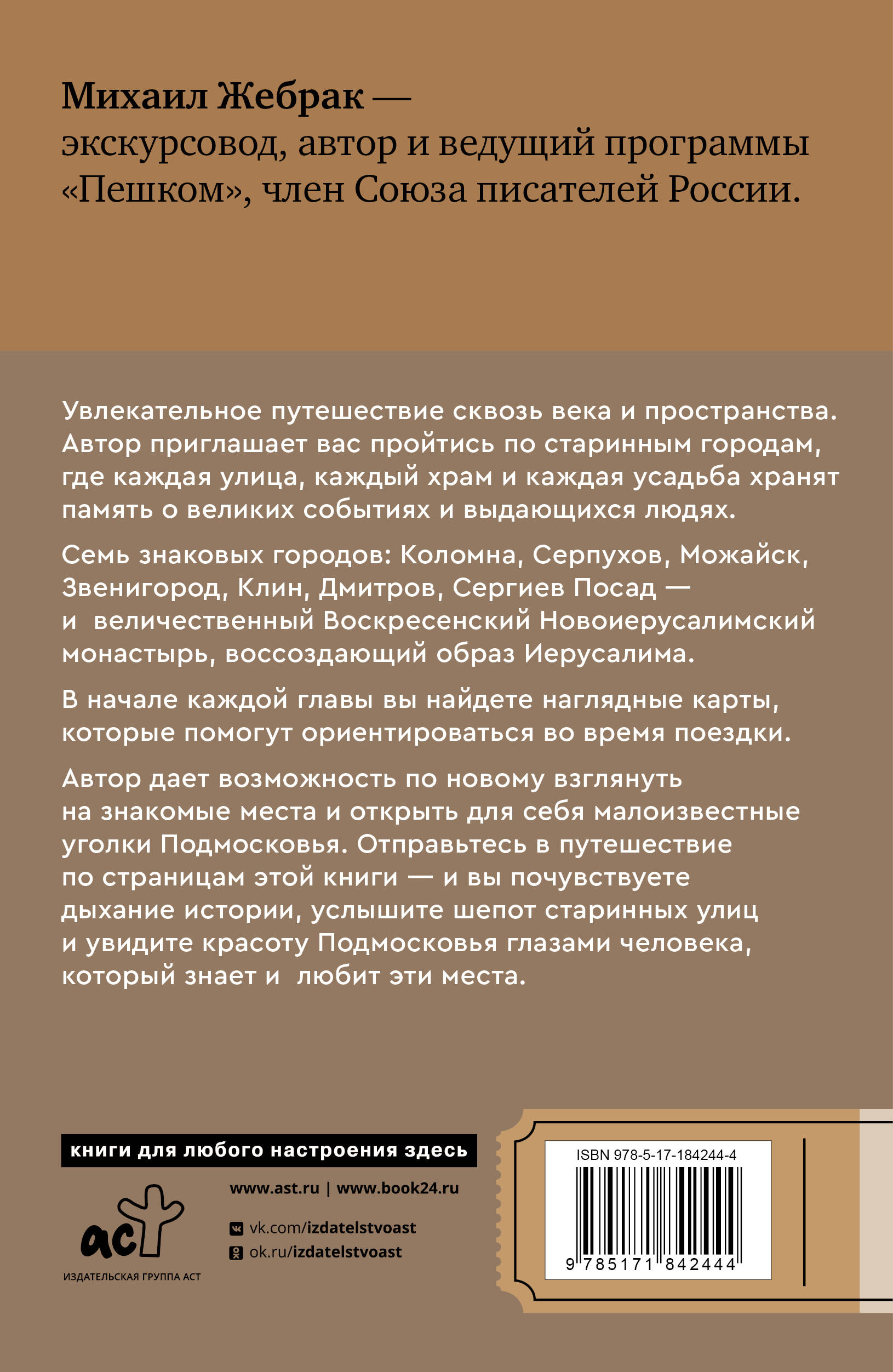 Откройте для себя Подмосковье глазами опытного экскурсовода и увлеченного рассказчика — Михаила Жебрака, автора и ведущего популярной программы «Пешком», члена Союза писателей России. Эта книга — увлекательное путешествие сквозь века и пространства. Автор приглашает вас пройтись по старинным городам, где каждая улица, каждый храм и каждая усадьба хранят память о великих событиях и выдающихся людях.