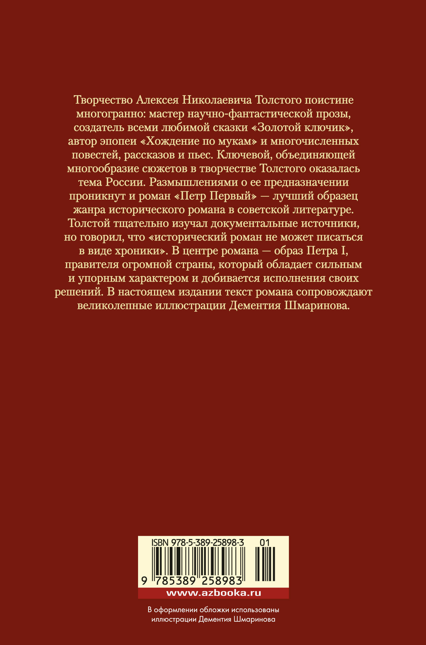 Творчество Алексея Николаевича Толстого поистине многогранно: мастер научно-фантастической прозы, создатель всеми любимой сказки "Золотой ключик", автор эпопеи "Хождение по мукам" и многочисленных повестей, рассказов и пьес. Ключевой, объединяющей многообразие сюжетов в творчестве Толстого оказалась тема России. Размышлениями о ее предназначении проникнут и роман "Петр Первый" — лучший образец жанра исторического романа в советской литературе. Толстой тщательно изучал документальные источники, но говорил, что "исторический роман не может писаться в виде хроники". В центре романа — образ Петра I, правителя огромной страны, который обладает сильным и упорным характером и добивается исполнения своих решений. В настоящем издании текст романа сопровождают великолепные иллюстрации Дементия Шмаринова.