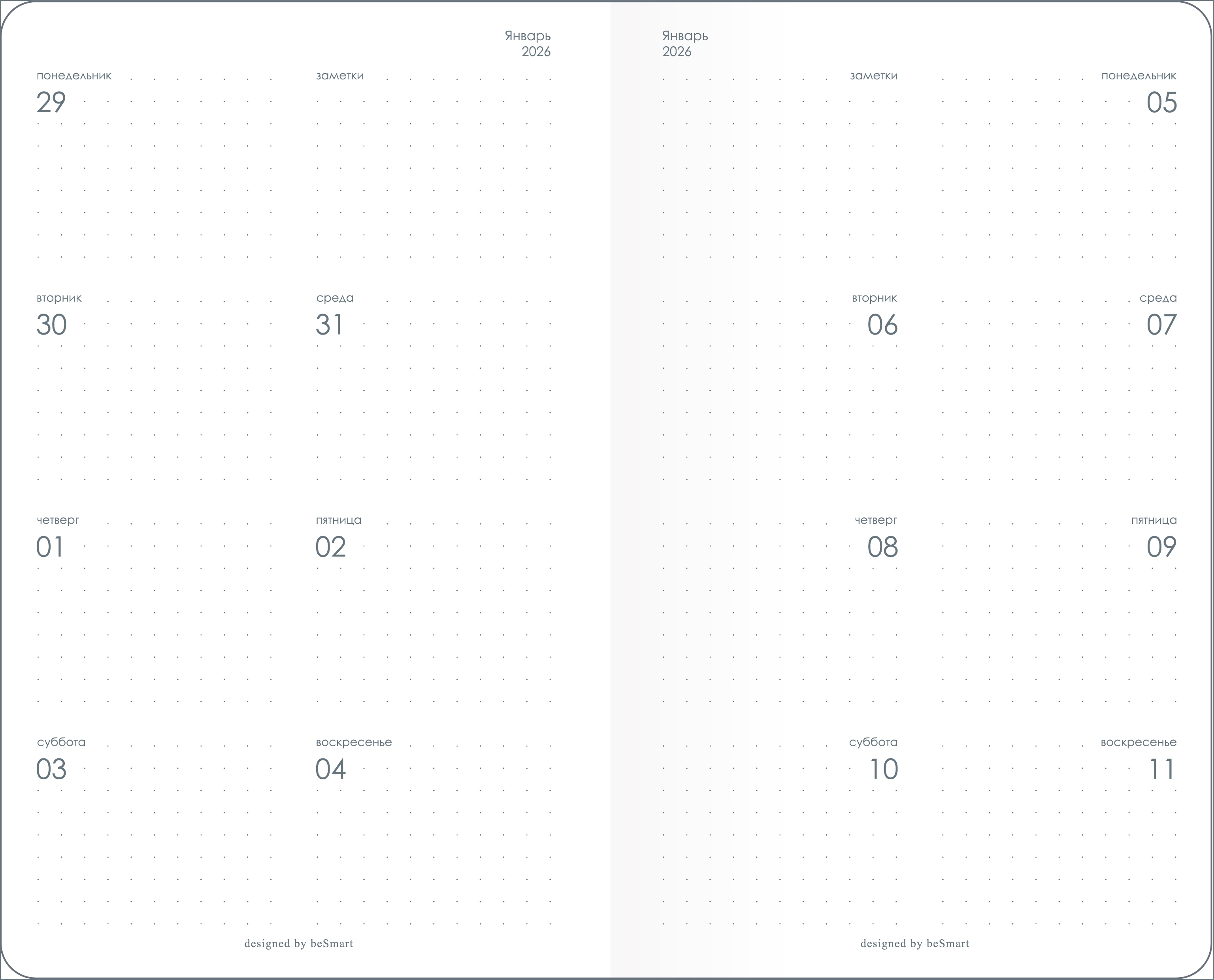 Обложка: картон 230 г/м2, печать 4+4, ламинация, микротекстурирование. Скрепка. Внутренний блок: датированный еженедельник, неделя на одной странице, бумага 65 г/м2, печать 1+1.