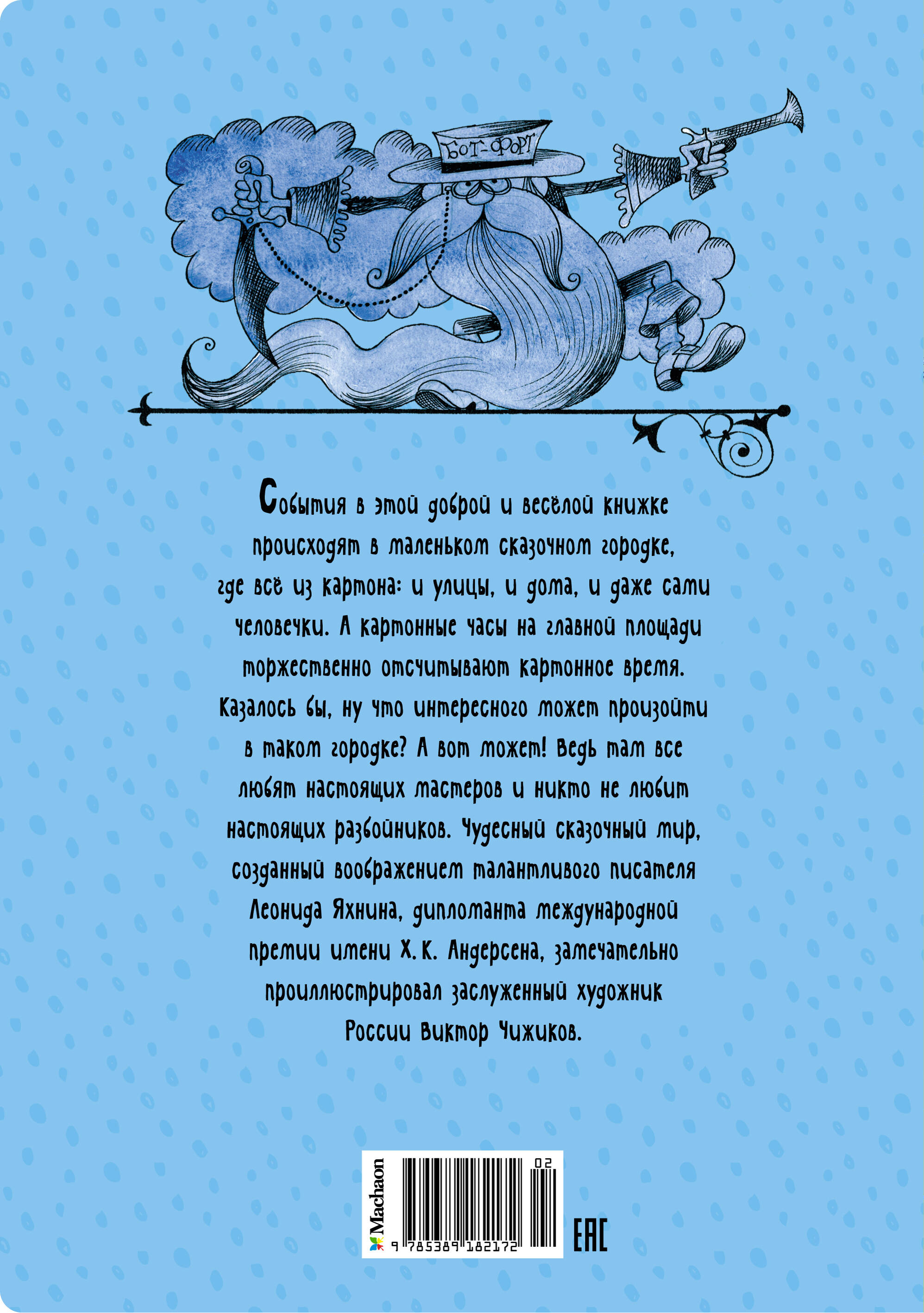 Добрая и весёлая история о приключениях жителей картонного городка, в котором все любят настоящих мастеров и никто не любит настоящих разбойников. Чудесный сказочный мир, созданный воображением талантливого писателя Леонида Яхнина, дипломанта международной премии имени Х.К. Андерсена, замечательно проиллюстрировал заслуженный художник России Виктор Чижиков.