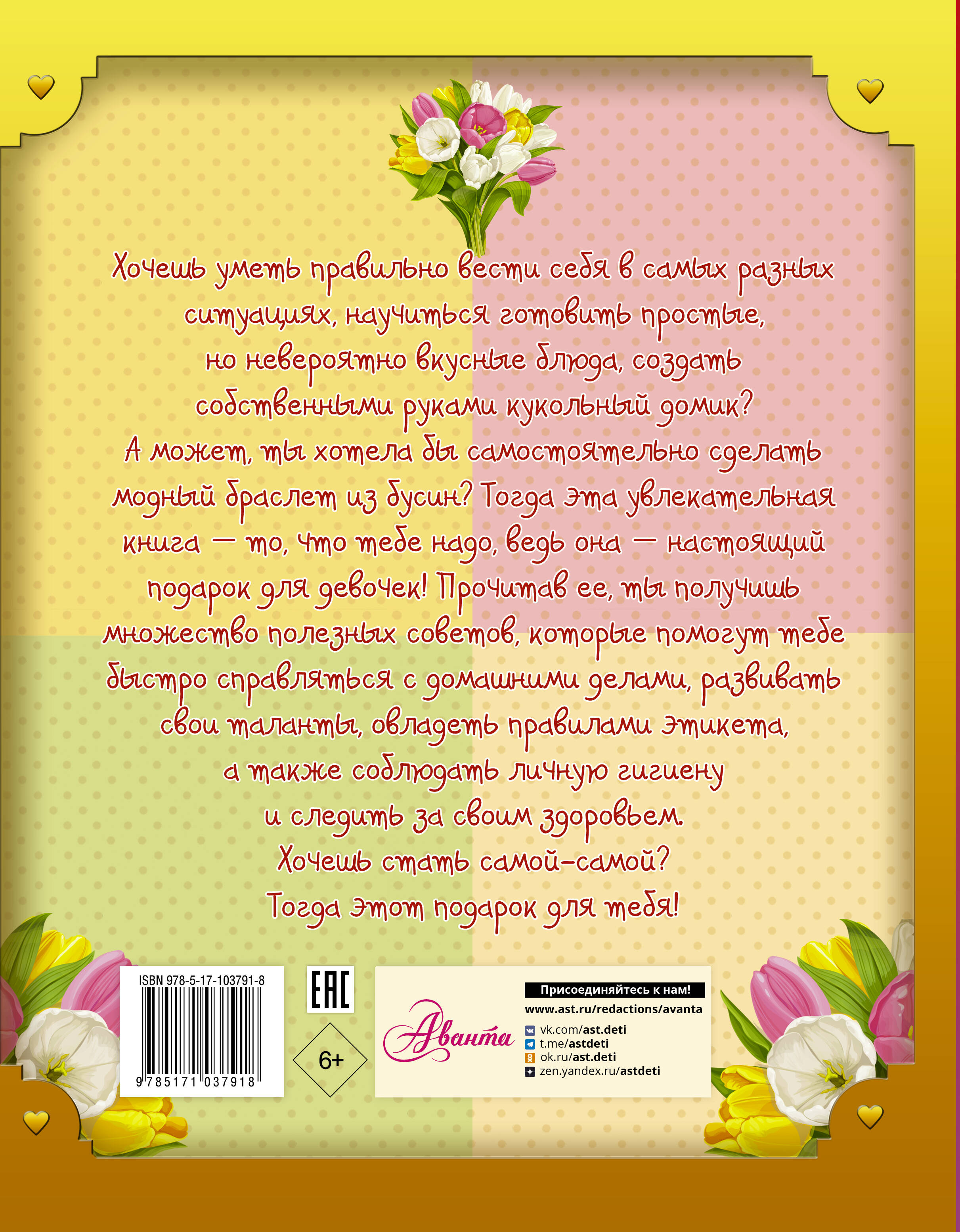 Каждая девочка мечтает отлично учиться, выделяться из толпы сверстников неординарными талантами, хорошо готовить, уметь поддерживать уют и порядок дома и, конечно, знать, как правильно себя вести в той или иной ситуации. Сколько непростых задач! Как же со всеми справиться? На самом деле все очень просто: открой эту удивительную книгу, и она непременно придет тебе на помощь, ведь это самый настоящий подарок для каждой девочки! Следуя ее советам, ты сможешь легко составить правильный распорядок дня и узнаешь, почему так важно его соблюдать, научишься правилам этикета за столом, в школе и общественных местах, откроешь для себя рецепты простых, но невероятно вкусных и оригинальных блюд и непременно найдешь себе занятие по душе, которое поможет проводить досуг с пользой.