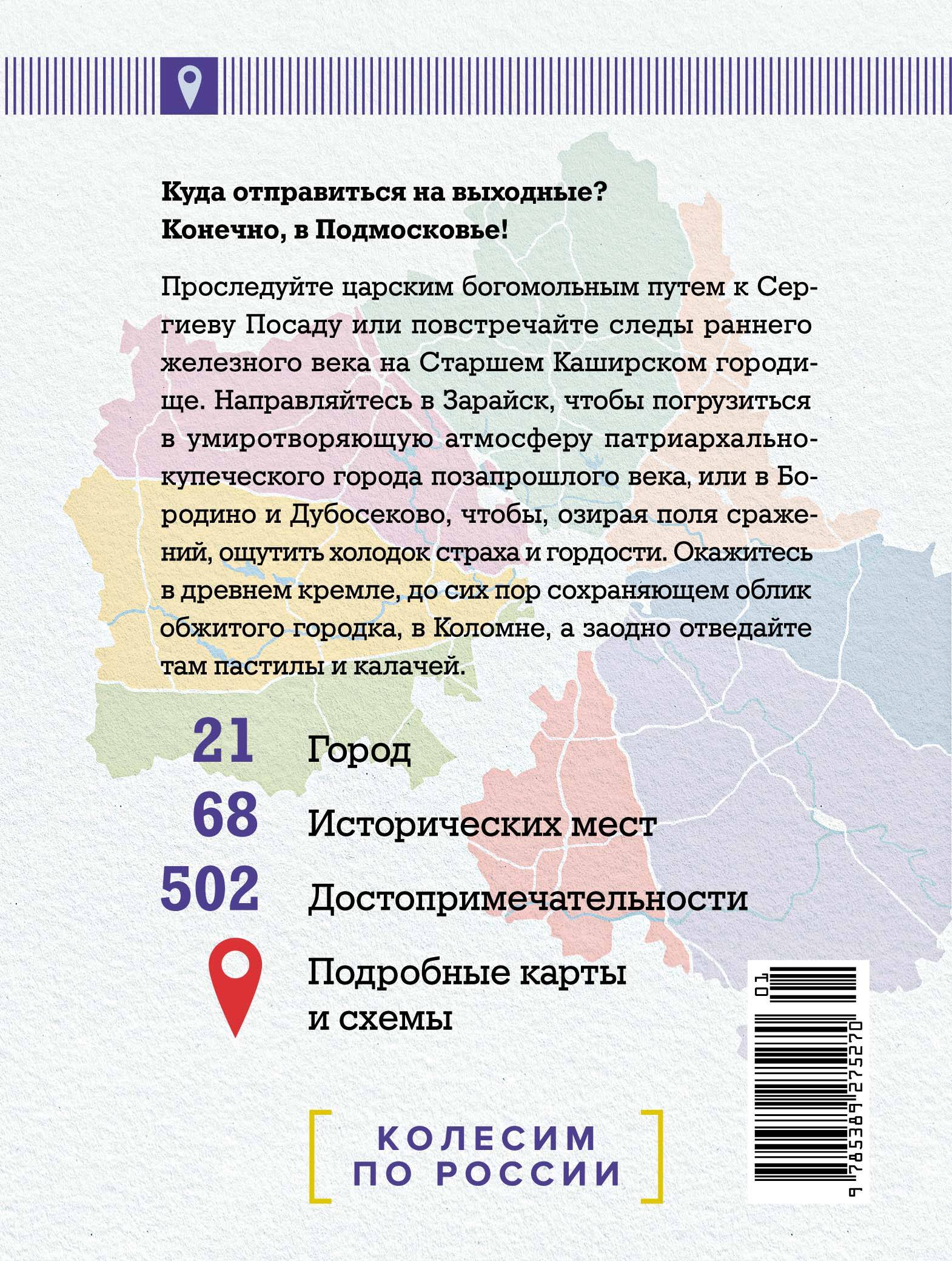Проследуйте царским богомольным путем к Сергиеву Посаду или повстречайте следы раннего железного века на Старшем Каширском городище. Направляйтесь в Зарайск, чтобы погрузиться в умиротворяющую атмосферу патриархально-купеческий города позапрошлого века — или в Бородино и Дубосеково, чтобы, озирая поля сражений, ощутить холодок страха и гордости. Окажитесь в древнем кремле, до сих пор сохраняющем облик обжитого городка, в Коломне, а заодно отведайте там пастилы и калачей.
