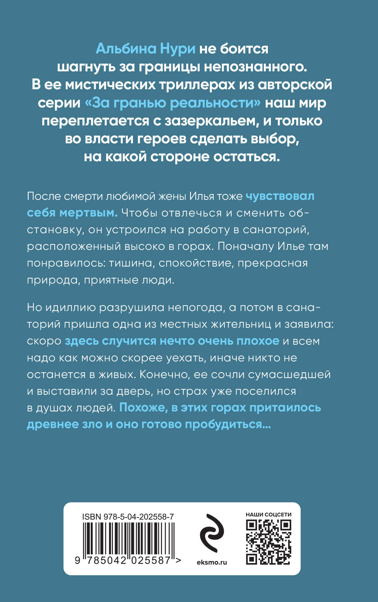 После смерти любимой жены Илья тоже чувствовал себя мертвым. Чтобы отвлечься и сменить обстановку, он устроился на работу в санаторий, расположенный высоко в горах. Поначалу Илье там понравилось: тишина, спокойствие, прекрасная природа, приятные люди. Но идиллию разрушила непогода, а потом в санаторий пришла одна из местных жительниц и заявила: скоро здесь случится нечто очень плохое и всем надо как можно скорее уехать, иначе никто не останется в живых. Конечно, ее сочли сумасшедшей и выставили за дверь, но страх уже поселился в душах людей. Похоже, в этих горах притаилось древнее зло и оно готово пробудиться…