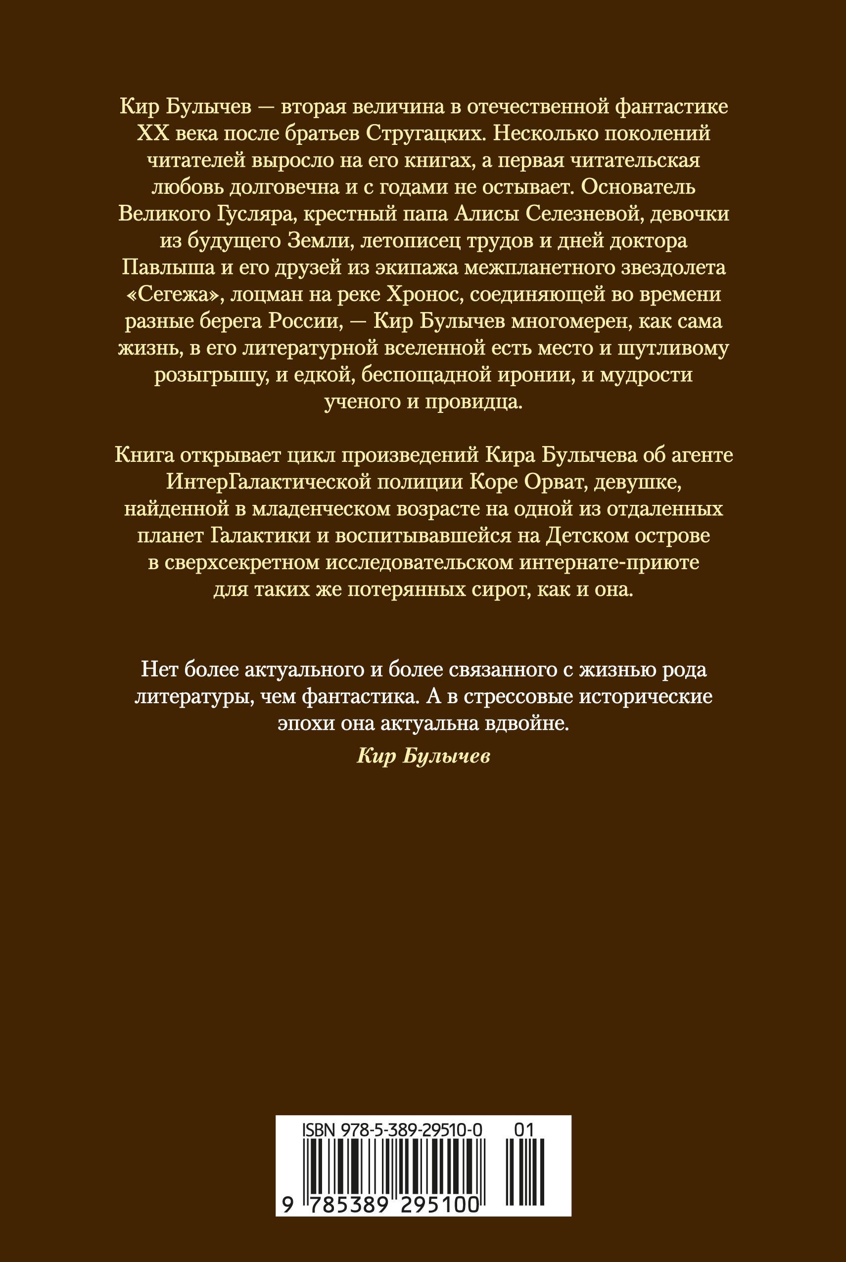 Кир Булычев — вторая величина в отечественной фантастике XX века после братьев Стругацких. Несколько поколений читателей выросло на его книгах, а первая читательская любовь долговечна и с годами не остывает. Основатель Великого Гусляра, крестный папа Алисы Селезневой, девочки из будущего Земли, летописец трудов и дней доктора Павлыша и его друзей из экипажа межпланетного звездолета «Сегежа», лоцман на реке Хронос, соединяющей во времени разные берега России — Кир Булычев многомерен, как сама жизнь, в его литературной вселенной есть место и шутливому розыгрышу, и едкой, беспощадной иронии, и мудрости ученого и провидца.