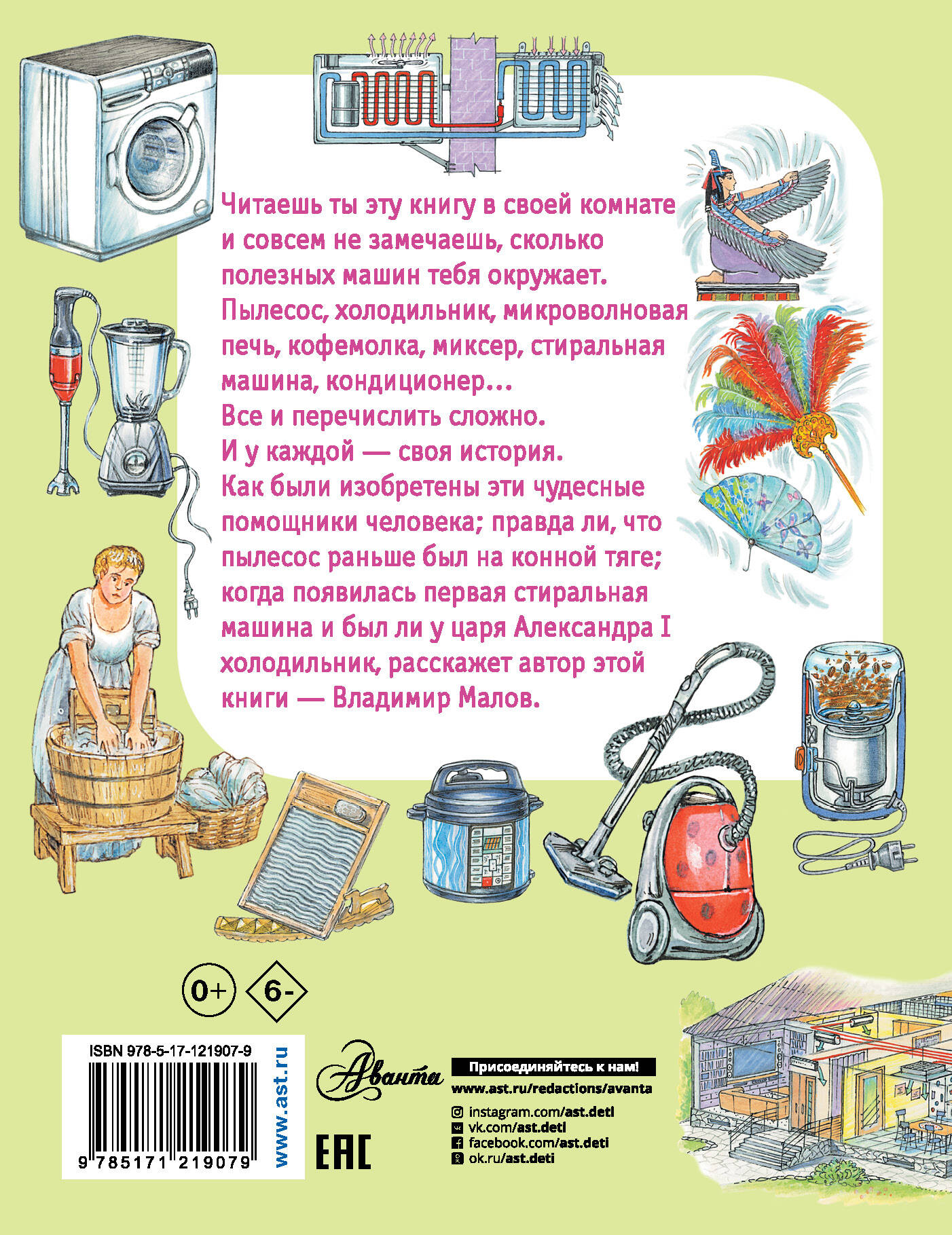 Читаешь ты эту книгу в своей комнате и совсем не замечаешь, сколько полезных машин тебя окружает. Пылесос, холодильник, микроволновая печь, кофемолка, миксер, стиральная машина, кондиционер… Все и перечислить сложно. И у каждого изобретения – своя история. Как были изобретены эти чудесные помощники человека, правда ли, что пылесос раньше был на конной тяге, когда появилась первая стиральная машина и был ли у царя Александра I холодильник, расскажет автор этой книги – Владимир Малов.