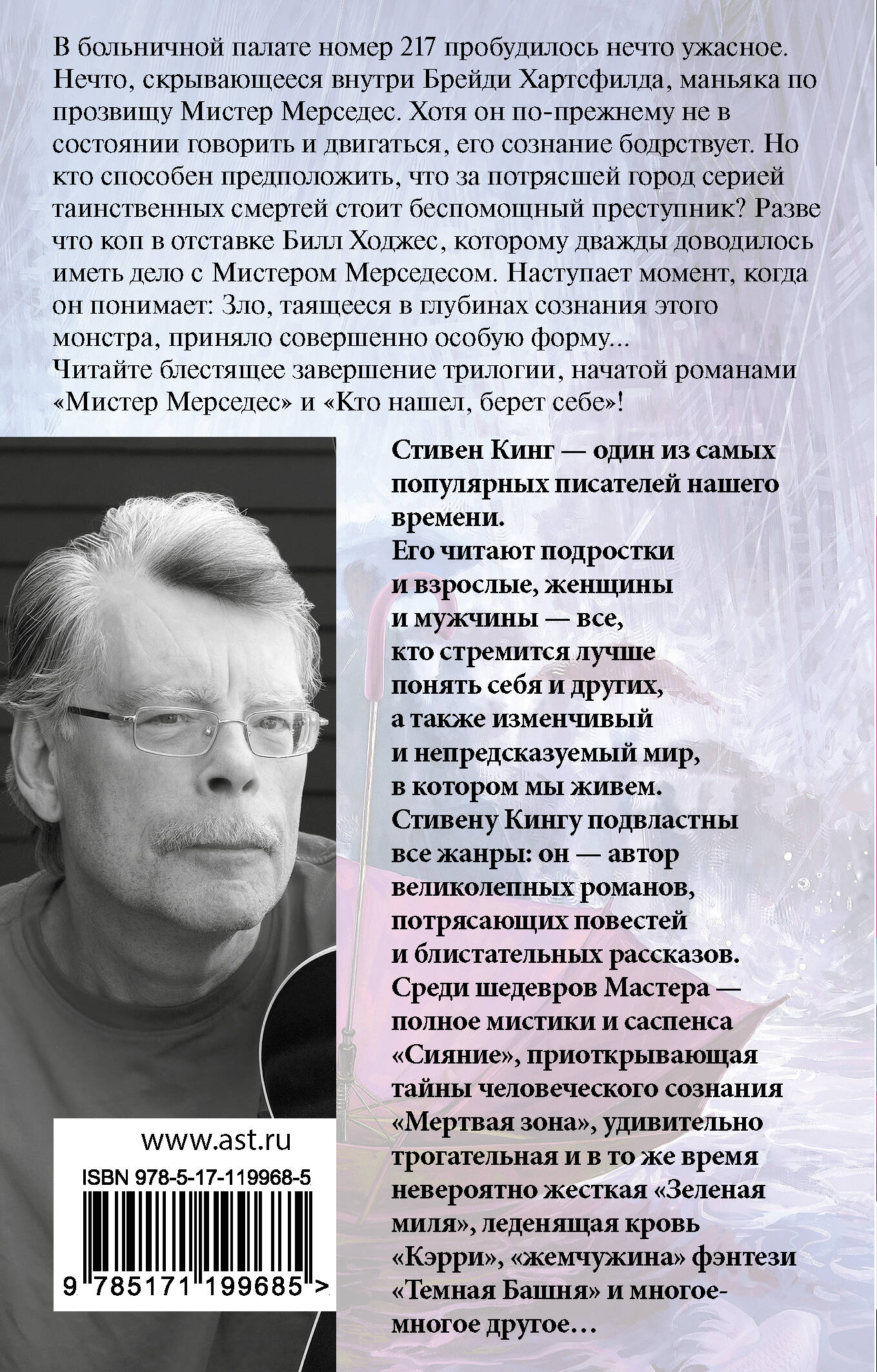 Но кто способен даже на мгновение предположить, что за потрясшей город серией таинственных смертей стоит беспомощный теперь преступник? Разве что коп в отставке Билл Ходжес, которому дважды доводилось иметь дело с Мистером Мерседесом. Наступает момент, когда он понимает: Зло, таящееся в глубинах сознания этого монстра, приняло совершенно особую форму.