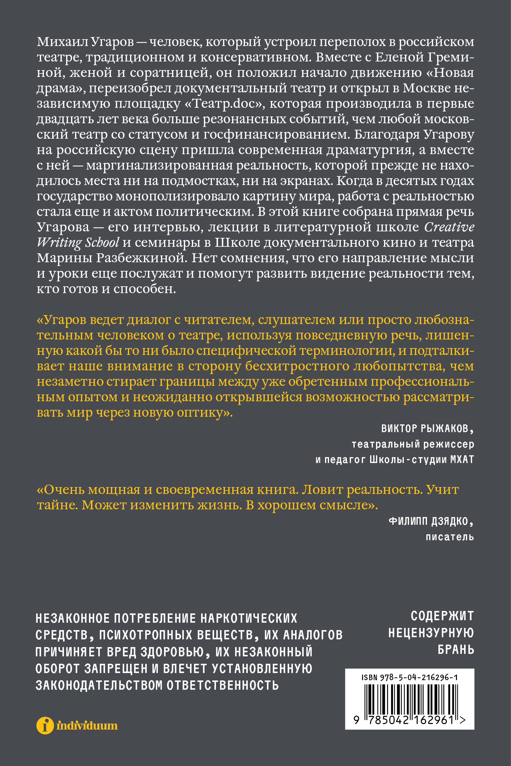 Михаил Угаров — человек, который устроил переполох в российском театре, традиционном и консервативном. Вместе с Еленой Греминой, женой и соратницей, он положил начало движению «Новая драма», переизобрел документальный театр и открыл в Москве независимую площадку «Театр.doc», которая производила в первые двадцать лет века больше резонансных событий, чем любой московский театр со статусом и госфинансированием. Благодаря Угарову на российскую сцену пришла современная драматургия, а вместе с ней — маргинализированная реальность, которой прежде не находилось места ни на подмостках, ни на экранах. Когда в десятых годах государство монополизировало картину мира, работа с реальностью стала еще и актом политическим. В этой книге собрана прямая речь Угарова — его интервью, лекции в литературной школе Creative Writing School и семинары в Школе документального кино и театра Марины Разбежкиной. Нет сомнения, что его направление мысли и уроки еще послужат и помогут развить видение реальности тем, кто готов и способен.