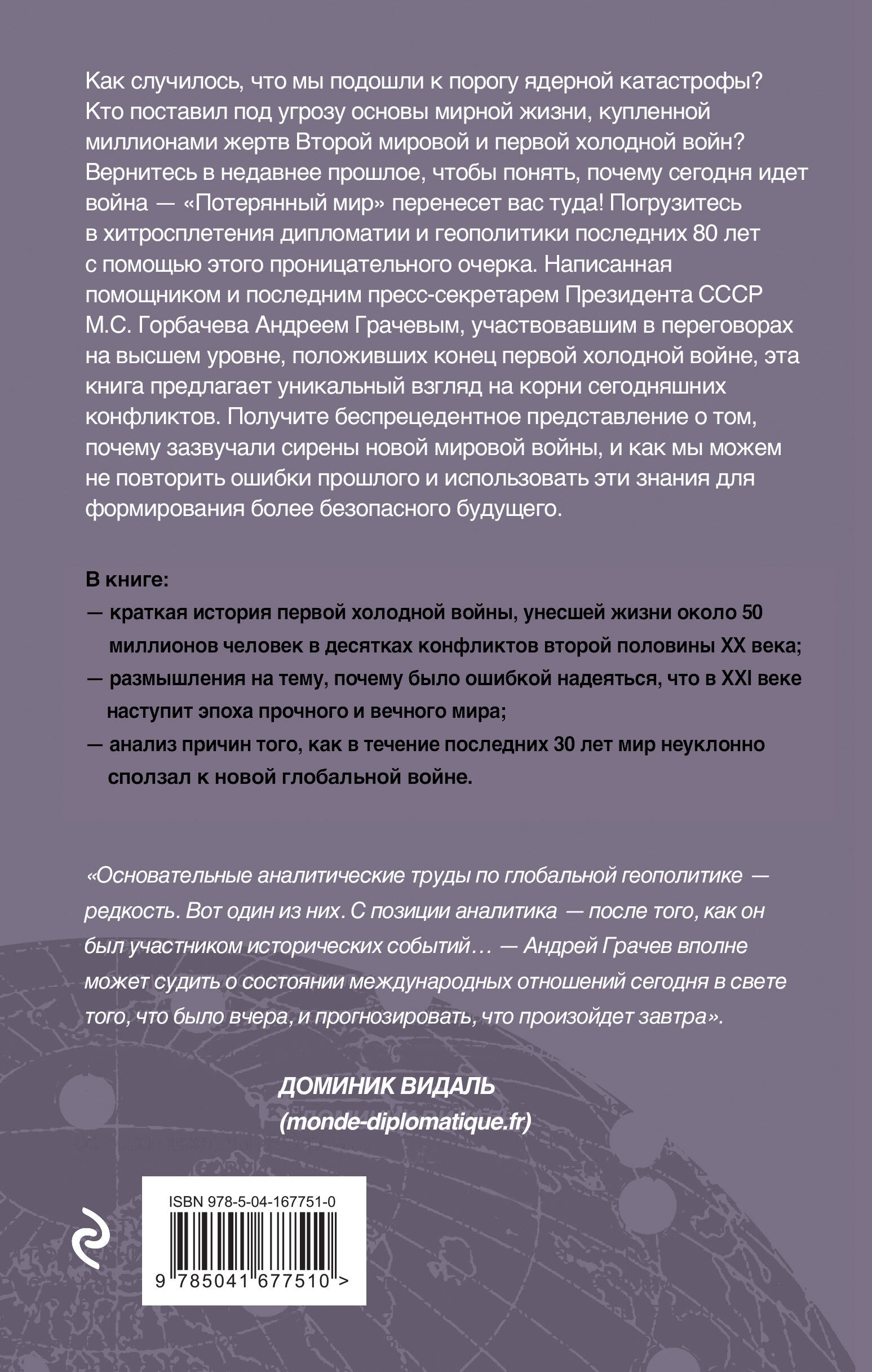 Как случилось, что мы подошли к порогу ядерной катастрофы? Кто поставил под угрозу основы мирной жизни, купленной миллионами жертв Второй мировой и первой холодной войн? Вернитесь в недавнее прошлое, чтобы понять, почему сегодня идет война — «Потерянный мир» перенесет вас туда! Погрузитесь в хитросплетения дипломатии и геополитики последних 80 лет с помощью этого проницательного очерка. Написанная помощником и последним пресс-секретарем Президента СССР М.С. Горбачева Андреем Грачевым, участвовавшим в переговорах на высшем уровне, положивших конец первой холодной войне, эта книга предлагает уникальный взгляд на корни сегодняшних конфликтов. Получите беспрецедентное представление о том, почему зазвучали сирены новой мировой войны и как мы можем использовать эти знания для формирования более безопасного будущего и не повторить ошибки прошлого.