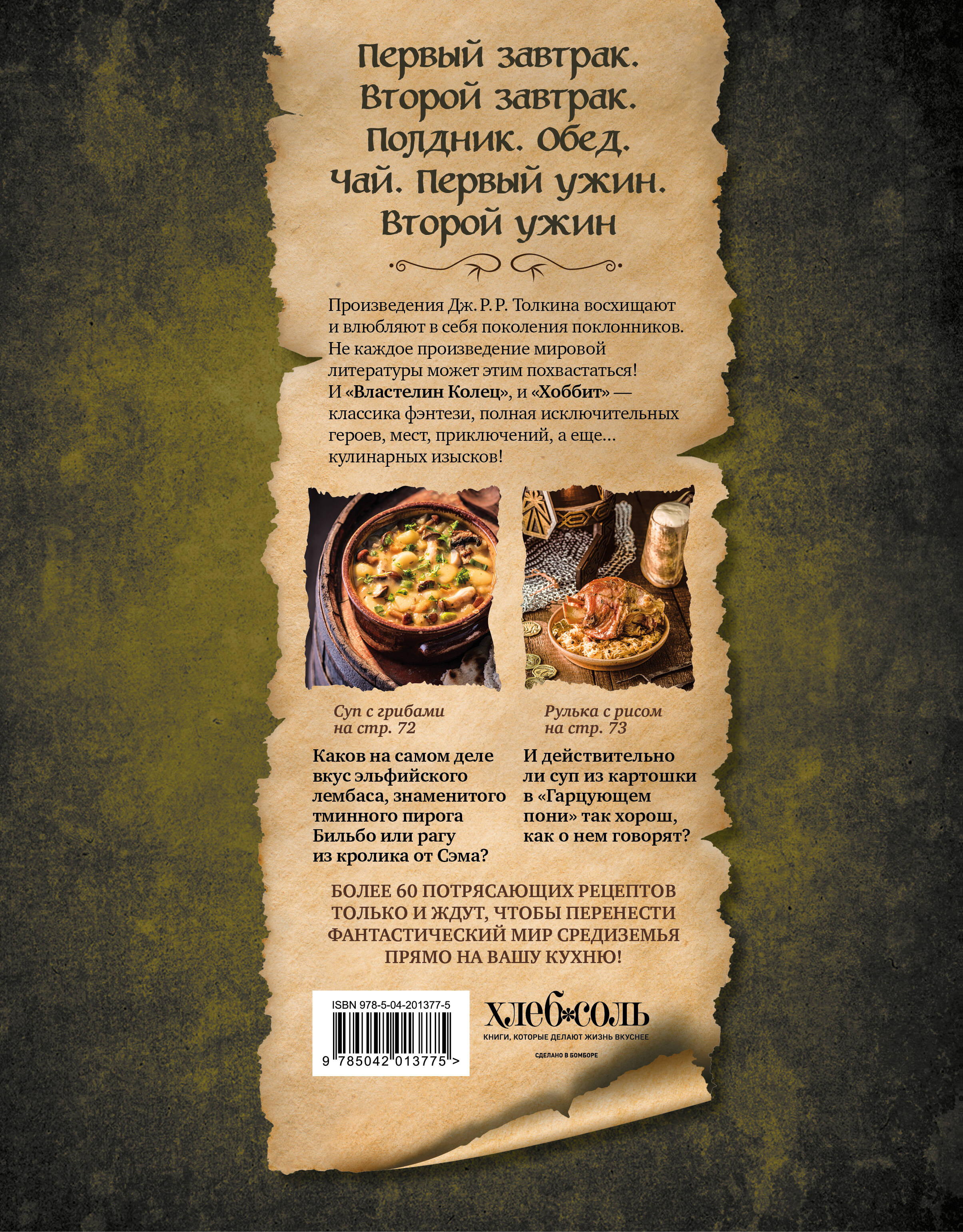 Вас ждет более 60 рецептов, вдохновленных легендарной фэнтези-вселенной Дж. Р. Р. Толкина. Это не только волшебный эльфийский хлеб и рагу, но и знаменитый кекс с тмином от Бильбо, гномья курица с эстрагоном от Турина, хоббитонские тыквенные булочки и другое. А если вы орк и едите совсем другие вещи — не отчаивайтесь, и для вас припасено кое-что: жаркое из хоббитов, хлеб на палках и истинно орочье варево.