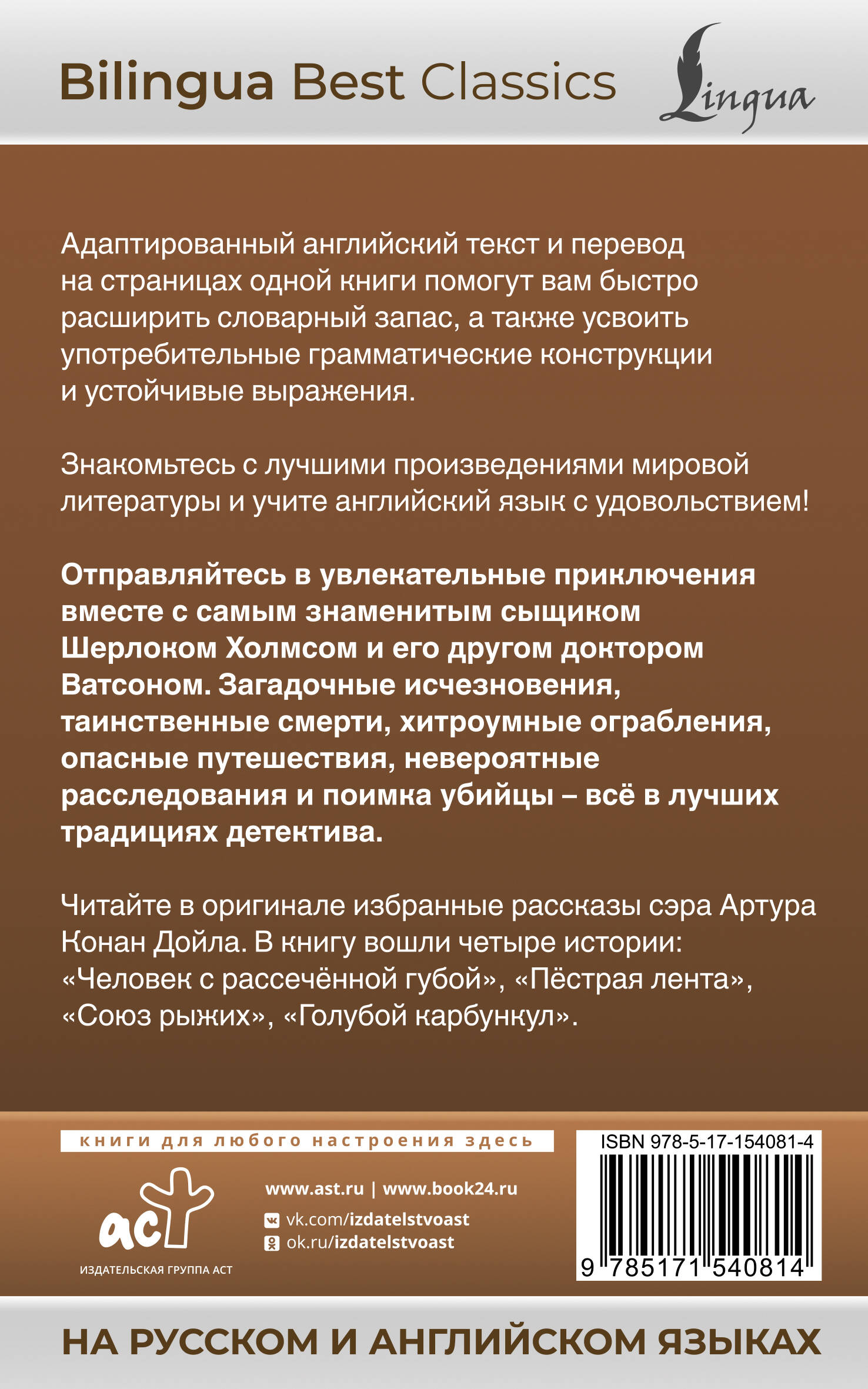Читайте в оригинале избранные рассказы сэра Артура Конан Дойла. В книгу вошли четыре истории: "Человек с рассечённой губой", "Пёстрая лента", "Союз рыжих", "Голубой карбункул". Адаптированный английский текст и перевод на страницах одной книги помогут легко познакомиться с лучшими произведениями мировой литературы и выучить английский язык с удовольствием. Благодаря параллельным текстам вы быстро расширите свой словарный запас, а также усвоите употребительные грамматические конструкции и устойчивые выражения.