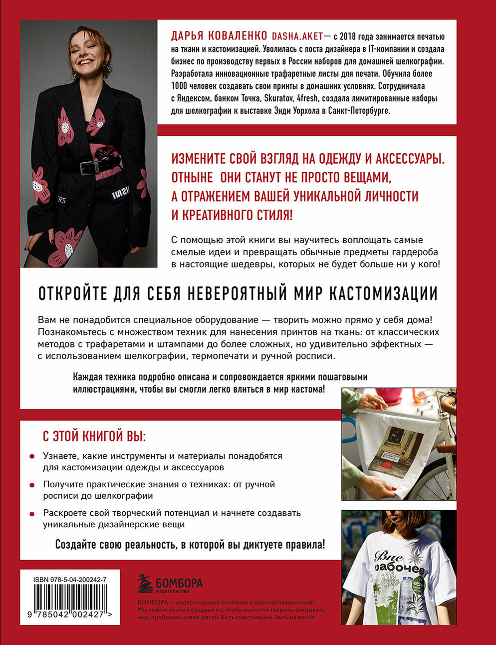 Откройте для себя мир кастома — искусства превращать обычные повседневные вещи в яркие и уникальные произведения искусства, отражающие вашу индивидуальность. С книгой Дарьи Коваленко dasha.aket — блогера, мастера кастомизации и основателя первого российского бренда для домашней шелкографии — вы сможете освоить это искусство и создать неповторимый гардероб своими руками.