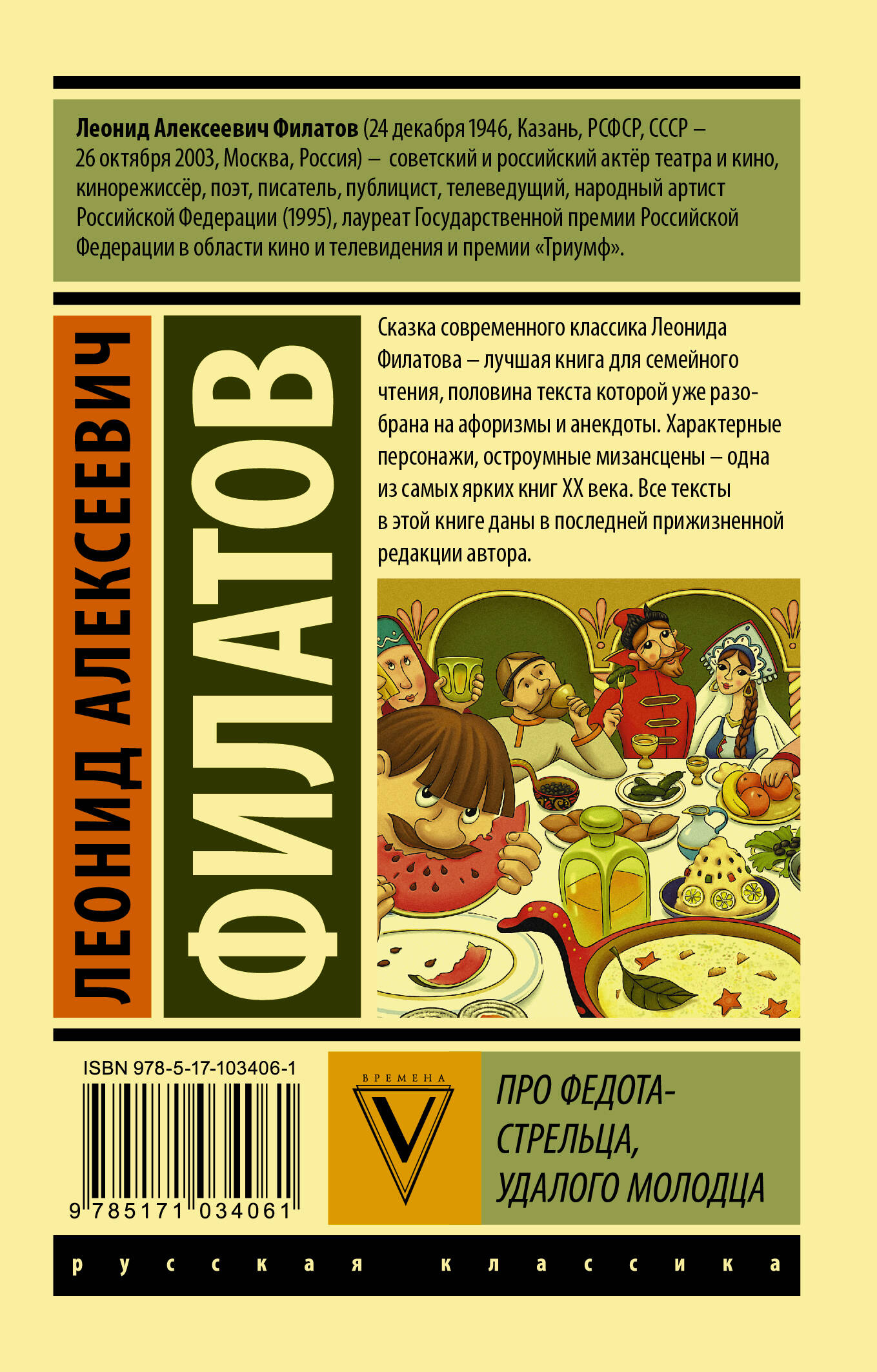 Характерные персонажи, остроумные мизансцены не оставят никого равнодушным. Сказку "Про Федота-стрельца" по праву можно назвать одной из самых ярких книг XX века. В издание также включены и другие пьесы и сказки Леонида Филатова.