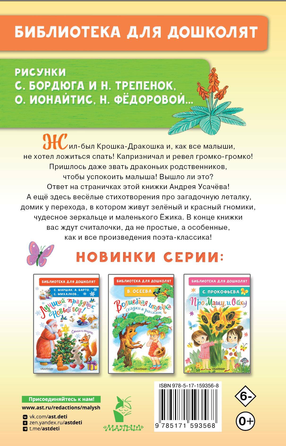 А ещё здесь весёлые стихотворения про загадочную леталку, домик у перехода, в котором живут зелёный и красный гномики, чудесное зеркальце и маленького Ёжика. В конце книжки вас ждут считалочки, да не простые, а особенные, как и все произведения поэта-классика!