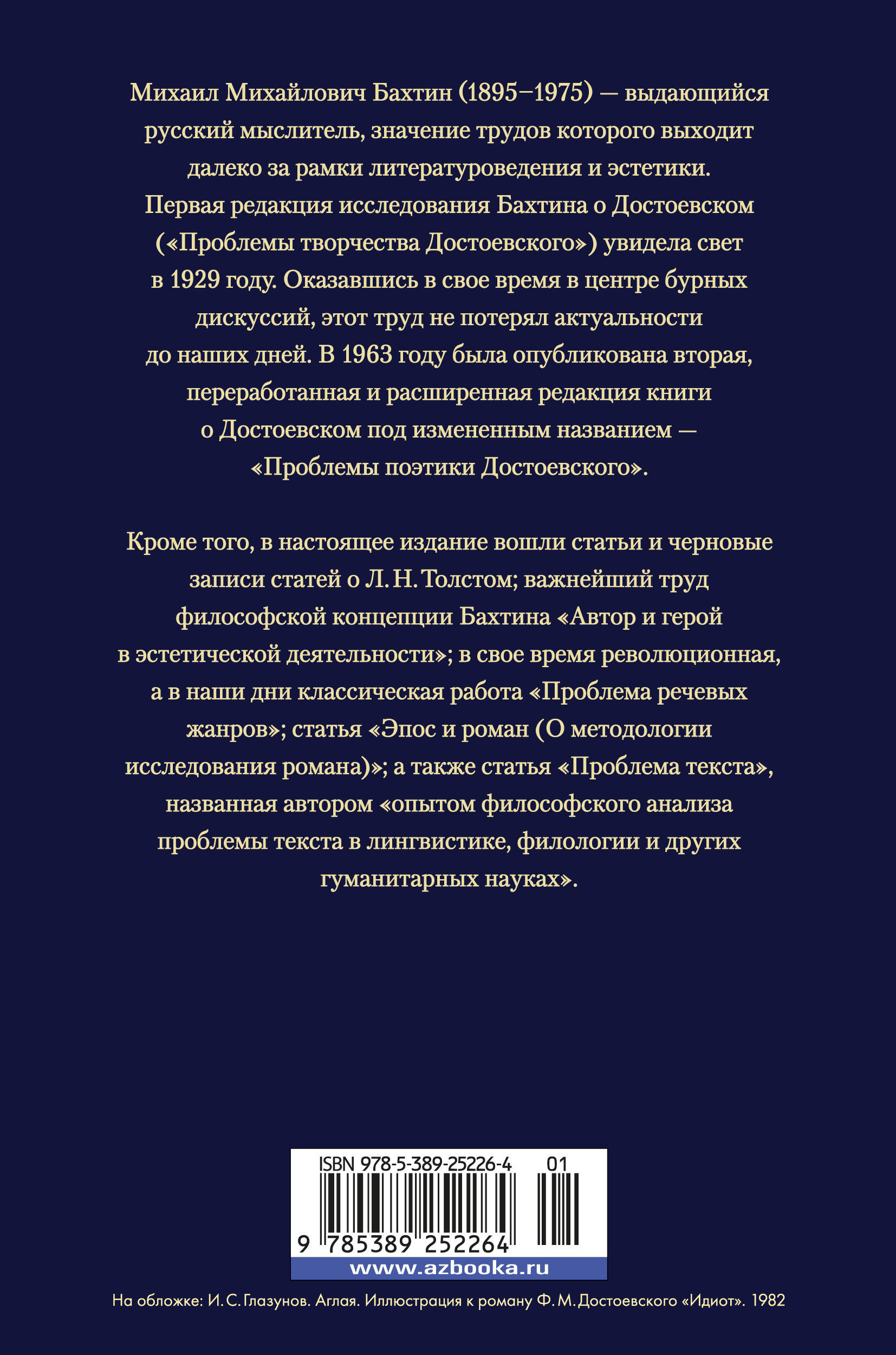 Михаил Михайлович Бахтин (1895–1975) — выдающийся русский мыслитель, значение трудов которого выходит далеко за рамки литературоведения и эстетики. Первая редакция исследования Бахтина о Достоевском ("Проблемы творчества Достоевского") увидела свет в 1929 году. Оказавшись в свое время в центре бурных дискуссий, этот труд не потерял актуальности до наших дней. В 1963 году была опубликована вторая, переработанная и расширенная редакция книги о Достоевском под измененным названием — "Проблемы поэтики Достоевского".