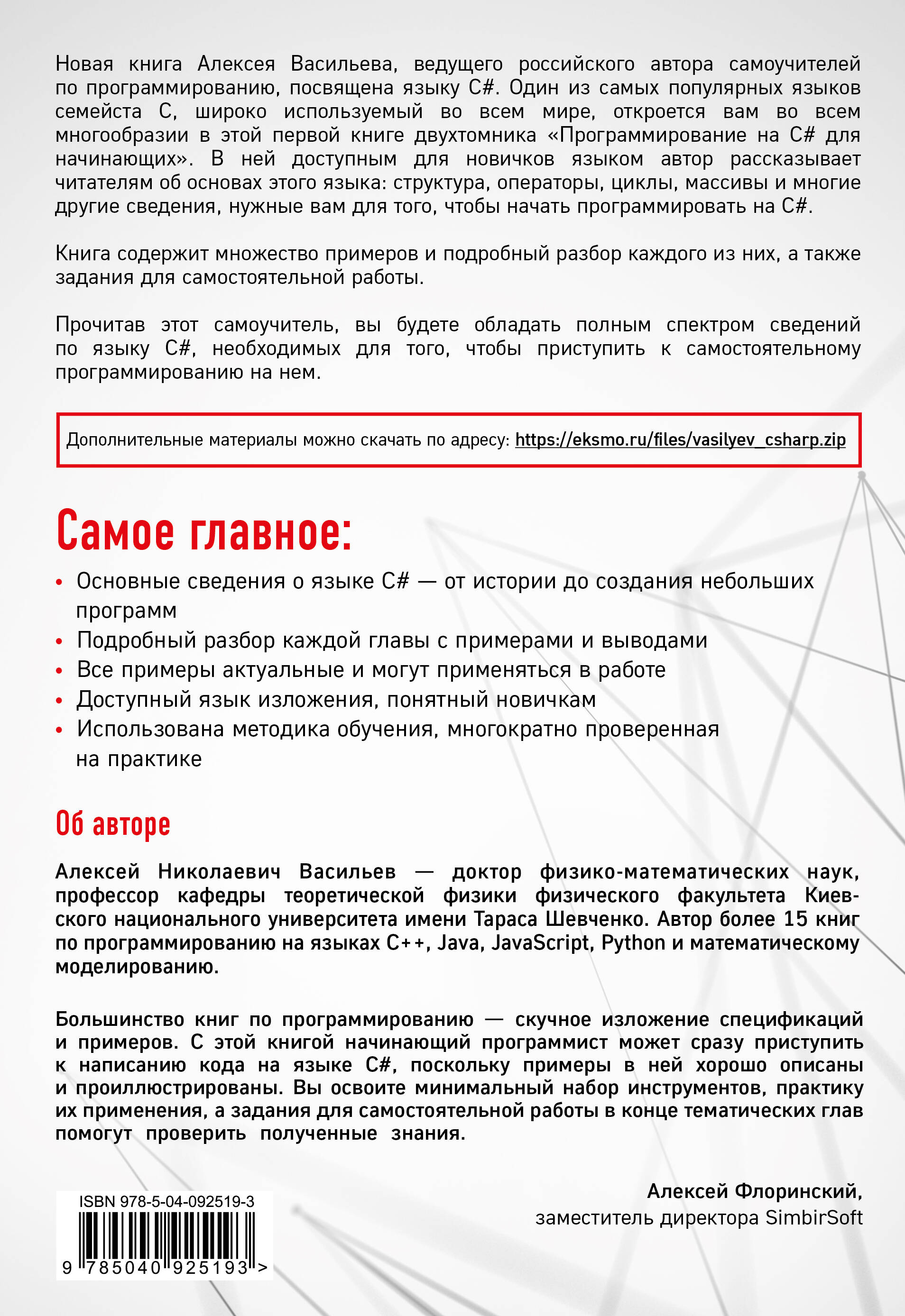Первая часть самоучителя по C#, написанного известным российским автором учебников по программированию Алексеем Васильевым. В этой книге автор приглашает читателей ознакомиться с основами языка C#. Прочитав ее, вы узнаете историю языка, его структуру, ознакомитесь с типами данных и переменными, операторами, циклами и множеством другой полезной информации, необходимой для работы с этим языком. Книга содержит множество примеров и подробный разбор каждого из них, а также задания для самостоятельной работы.