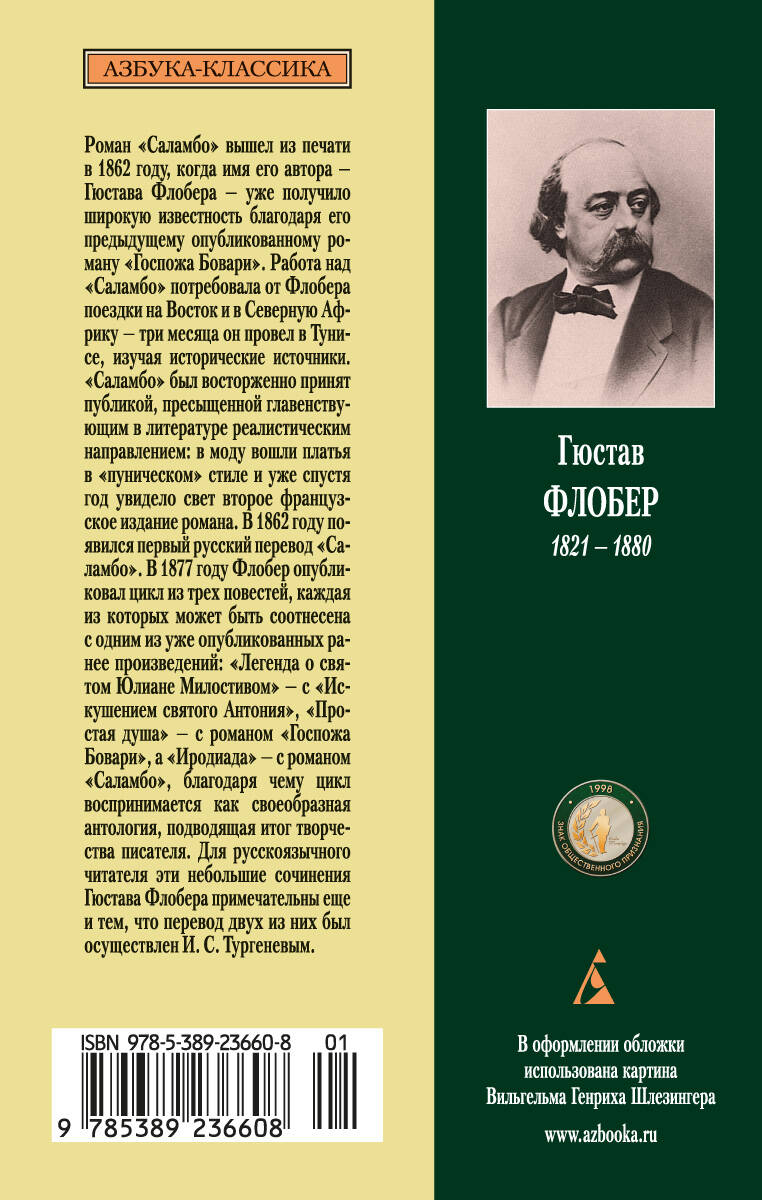 Роман "Саламбо" вышел из печати в 1862 году, когда имя его автора — Гюстава Флобера — уже получило широкую известность благодаря его предыдущему опубликованному роману "Госпожа Бовари". Работа над "Саламбо" потребовала от Флобера поездки на Восток и в Северную Африку — три месяца он провел в Тунисе, изучая исторические источники. "Саламбо" был восторженно принят публикой, пресыщенной главенствующим в литературе реалистическим направлением: в моду вошли платья в "пуническом" стиле, и уже спустя год увидело свет второе французское издание романа. В 1862 году появился первый русский перевод "Саламбо".