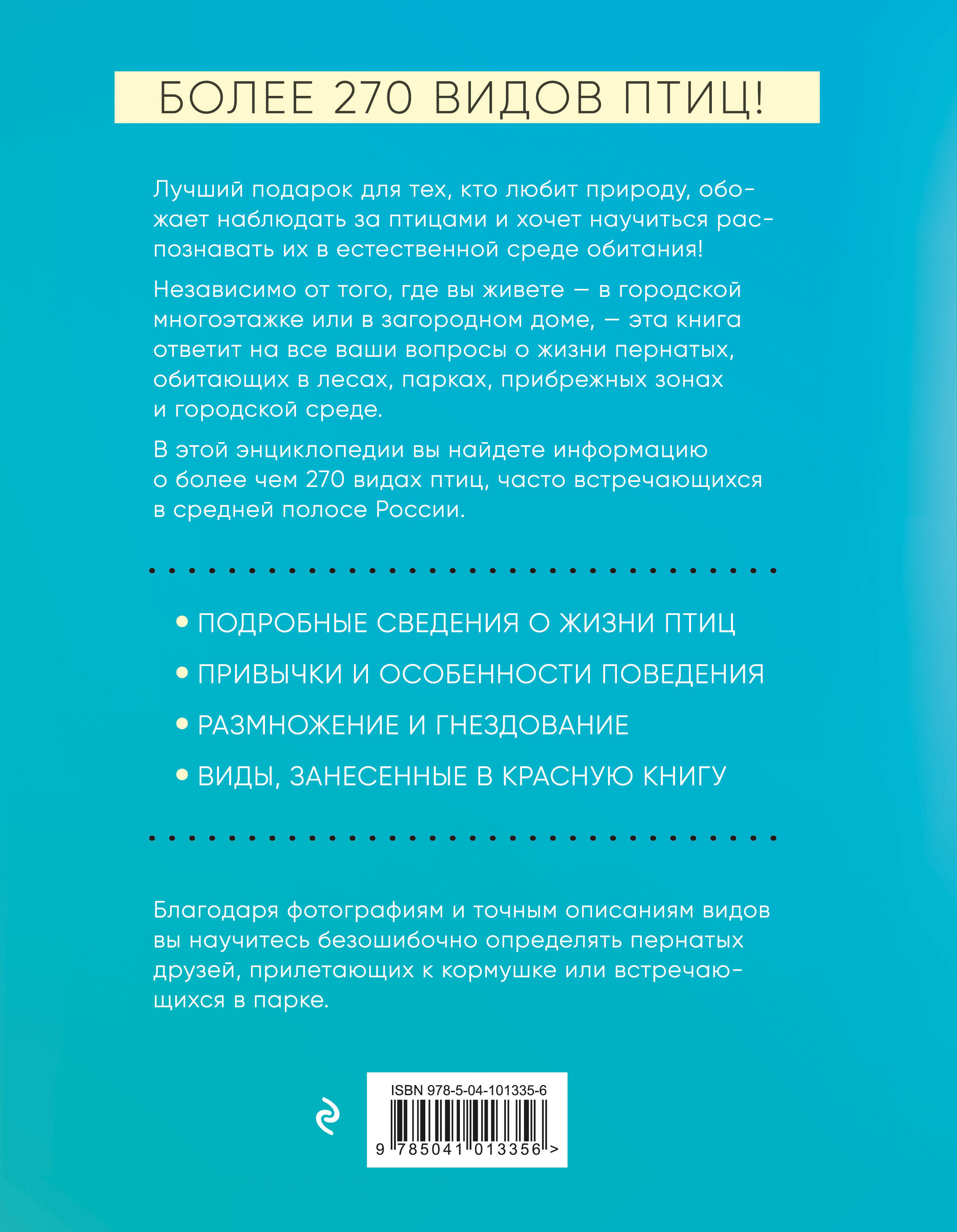В этой энциклопедии вы найдете более 270 видов птиц, наиболее часто встречающихся в средней полосе России. Это незаменимый справочник по идентификации пернатых, обитающих в лесах, парках, прибрежных зонах и городской среде. В нем содержатся подробные сведения о жизни птиц в кратком и удобном для читателя формате.