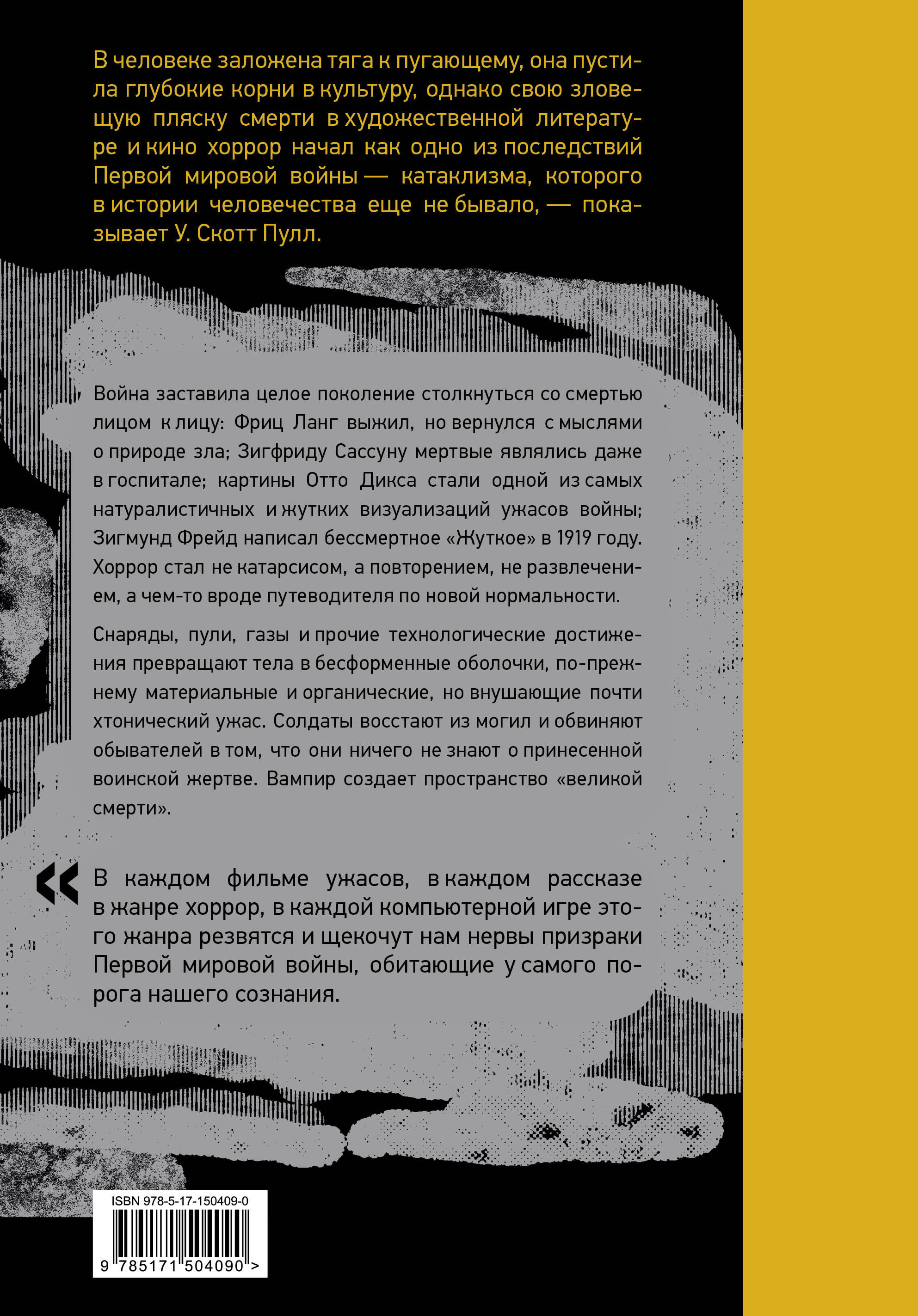 В человеке заложена тяга к пугающему, она пустила глубокие корни в культуру, однако свою зловещую пляску смерти в художественной литературе и кино хоррор начал как одно из последствий Первой мировой войны — катаклизма, которого в истории человечества еще не бывало, — показывает У. Скотт Пулл.
