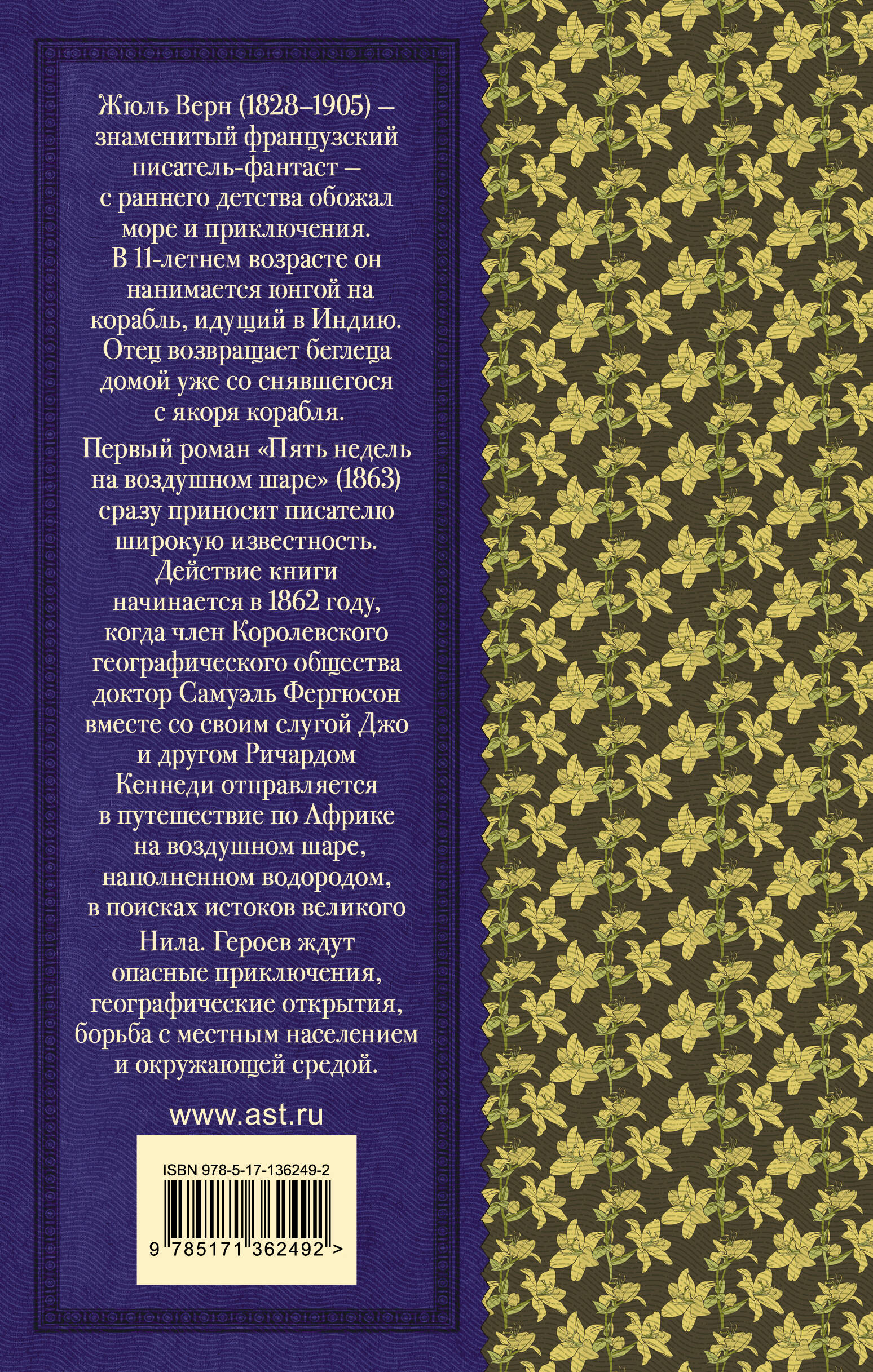 Первый роман "Пять недель на воздушном шаре" (1863) сразу приносит писателю широкую известность. Действие книги начинается в 1862 году, когда член Королевского географического общества доктор Самуэль Фергюсон вместе со своим слугой Джо и другом Ричардом Кеннеди отправляется в путешествие по Африке (к тому времени малоизведанной) на воздушном шаре, наполненном водородом, в поисках истоков великого Нила.