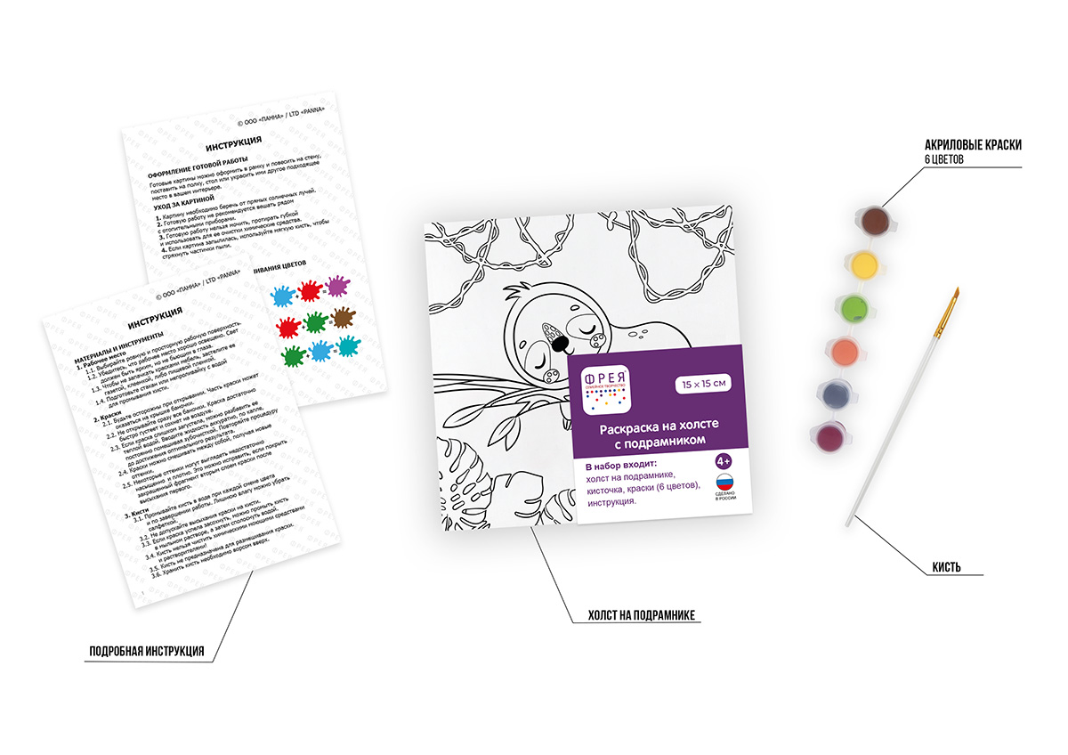 В набор входит все необходимое: холст для рисования на подрамнике с нанесенной схемой 15х15 см., краски , кисть, инструкция, схема смешения цветов.