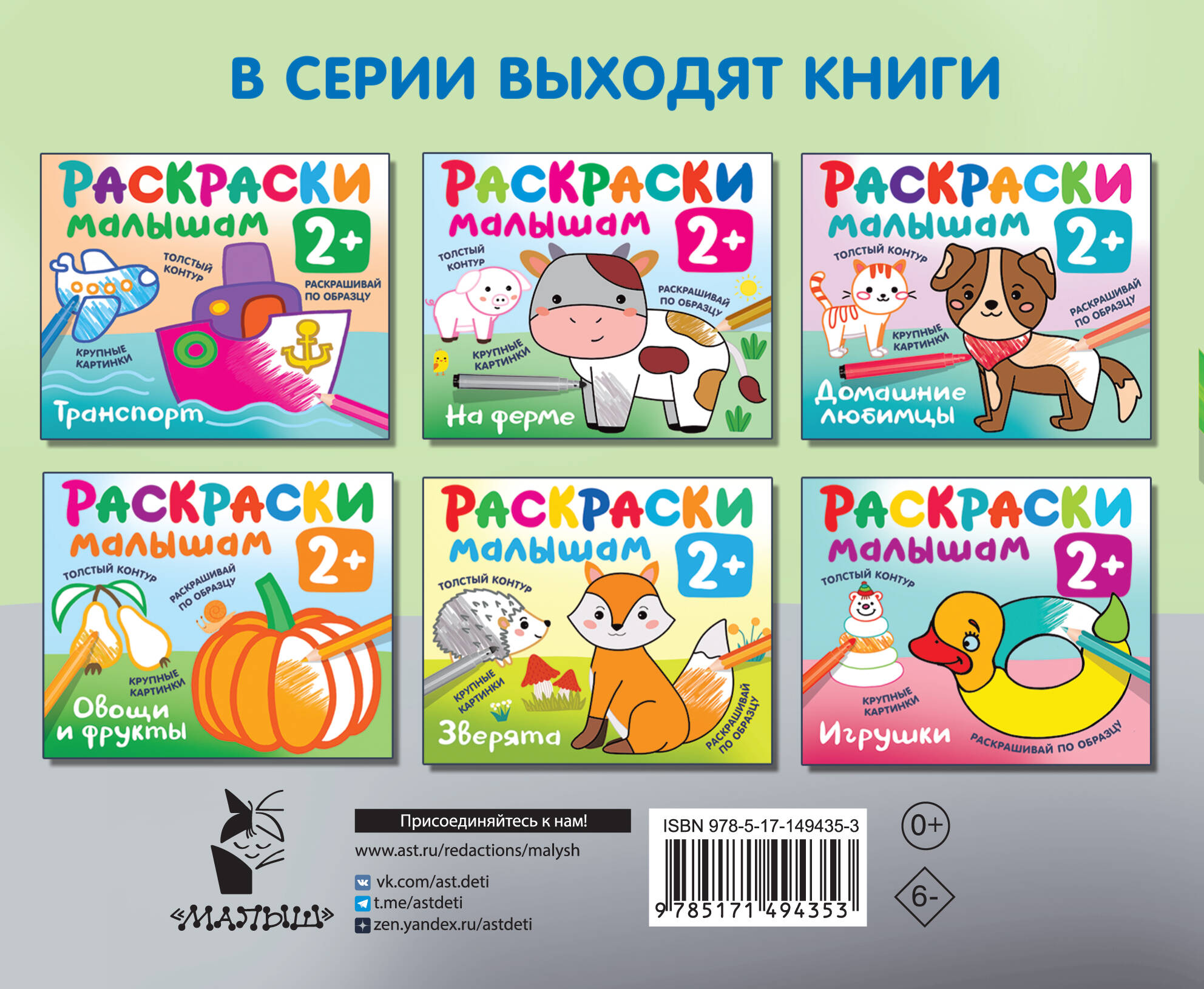 На страницах книжки — крупные картинки, которые можно раскрасить по образцу цветными карандашами, фломастерами, мелками, пальчиковыми красками.