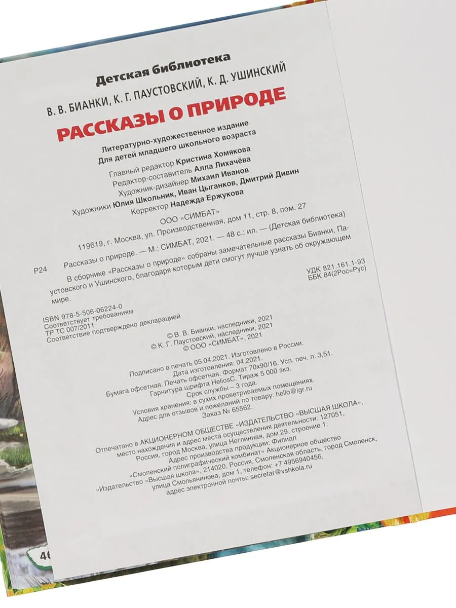 В сборнике представлены произведения таких известных русских писателей: Голубой зверёк, Сова, Хитрый лис и умная уточка, Музыкант В. Бианки; Заячьи лапы, Барсучий нос К. Паустовский; Жалобы зайки, Плутишка кот, Ласточка, Дятел К. Ушинский.