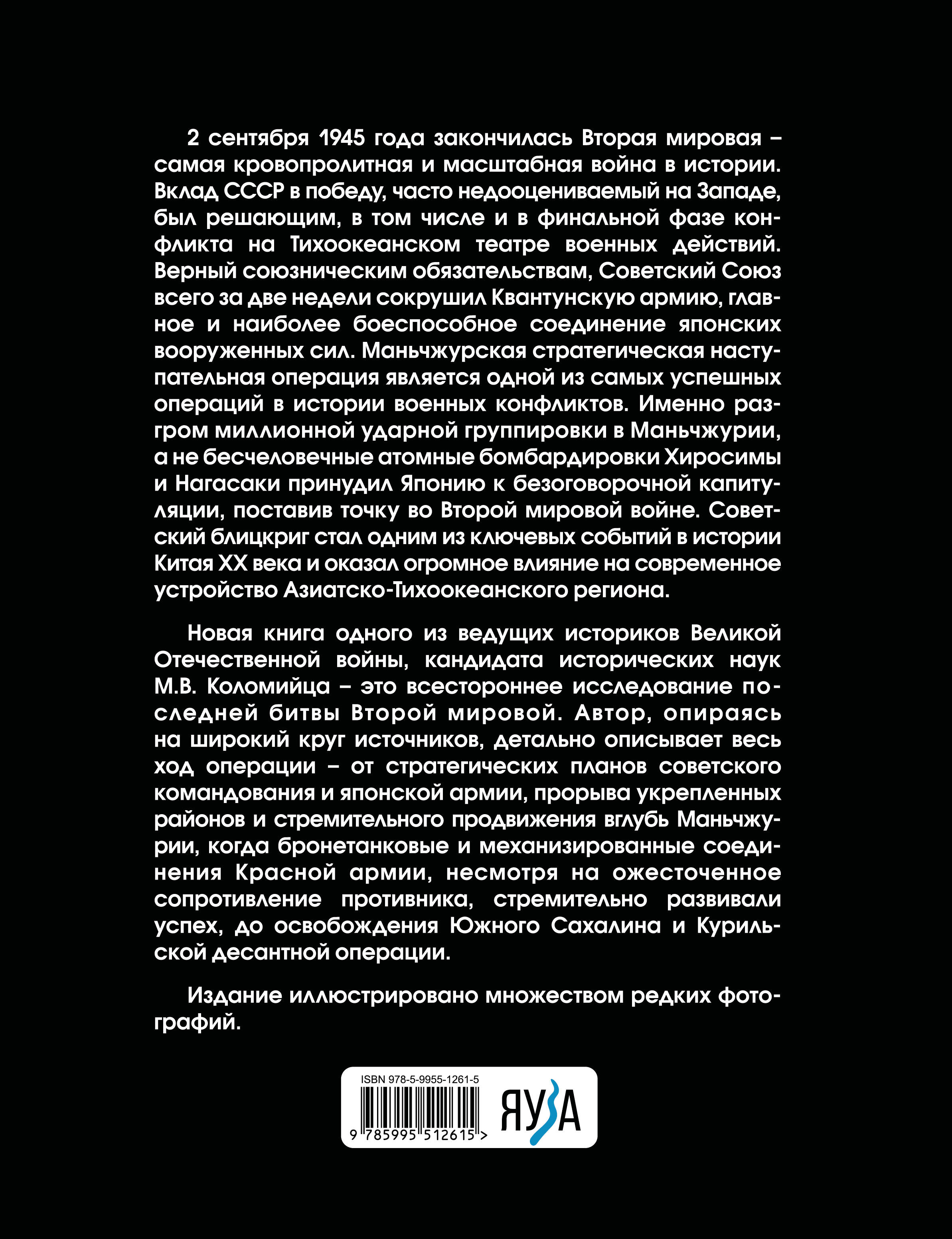 Новая книга одного из ведущих историков Великой Отечественной войны, кандидата исторических наук М.В. Коломийца – это всестороннее исследование последней битвы Второй Мировой. Автор, опираясь на широкий круг источников, детально описывает весь ход операции – от стратегических планов советского командования и японской армии, прорыва укрепленных районов и стремительного продвижения вглубь Маньчжурии, когда бронетанковые и механизированные соединения Красной Армии, несмотря на ожесточенное сопротивление противника, стремительно развивали успех, до освобождения Южного Сахалина и Курильской десантной операции.