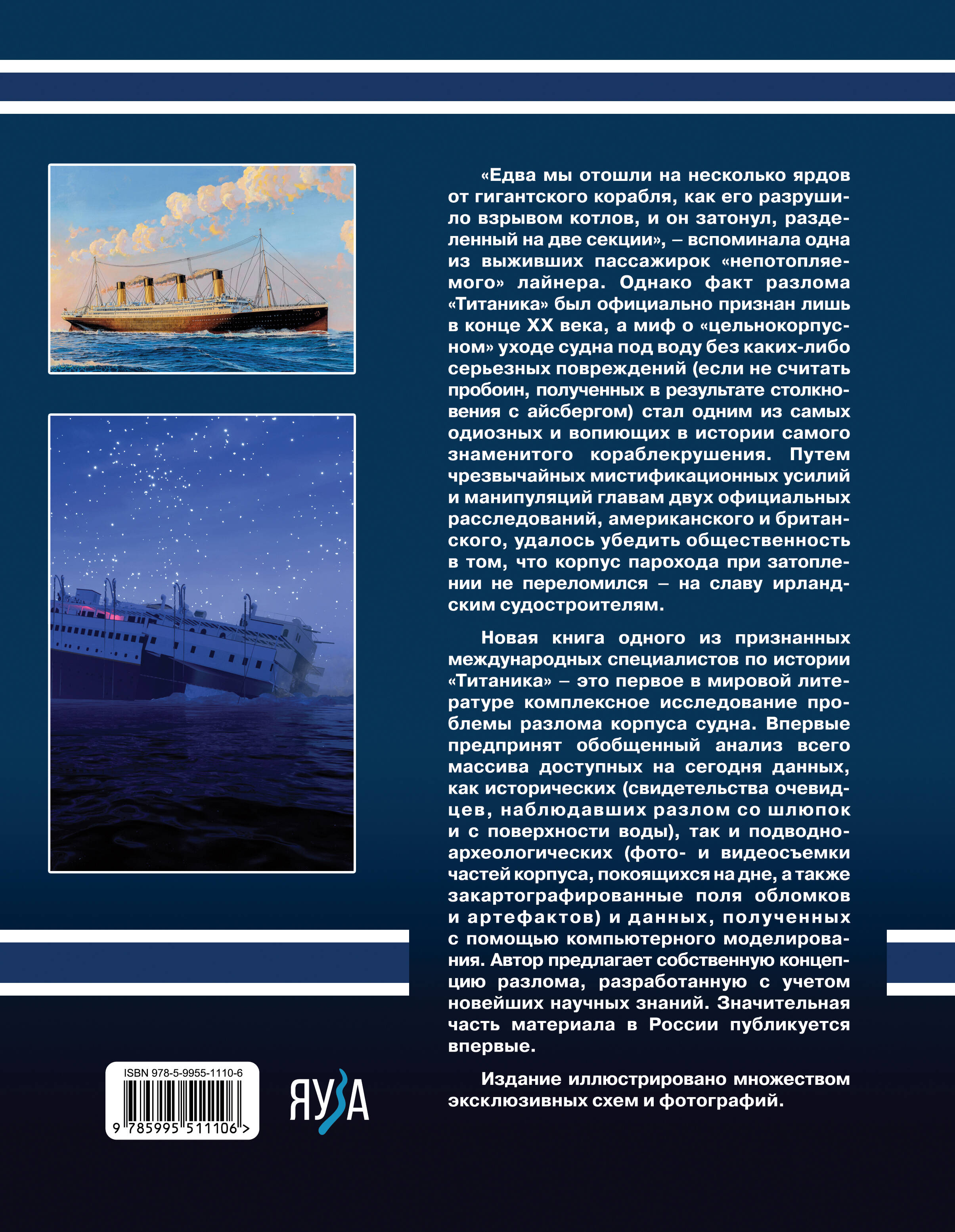 Новая книга одного из главных в мире специалистов по истории «Титаника» — это первое в мировой литературе комплексное исследование проблемы разлома корпуса судна. Впервые предпринят обобщенный анализ всего массива доступных на сегодня данных, как исторических (свидетельств очевидцев, наблюдавших разлом со шлюпок и с поверхности воды), так и подводно-археологических (фото- и видеосъемок частей корпуса, покоящихся на дне, а также закартографированных полей обломков и артефактов) и данных, полученных с помощью компьютерного моделирования. Автор предлагает собственную концепцию разлома, разработанную с учетом новейших научных знаний. Значительная часть материала в России публикуется впервые.